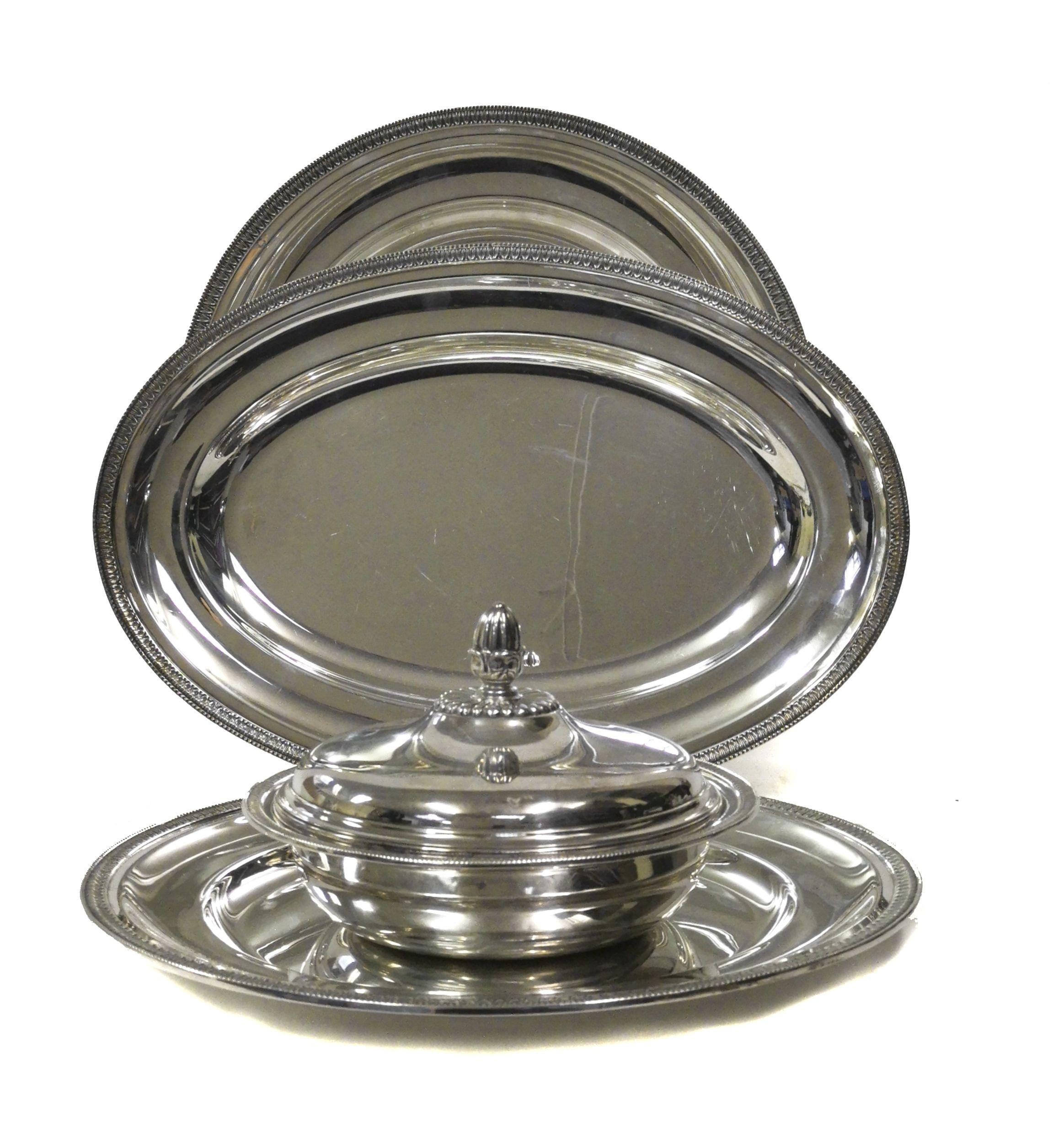 3402. Légumier rond, deux plats ronds et un plat ovale à décor néoclassique à bordure de feuilles d'eau,