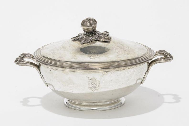155. Ecuelle ovale couverte sur présentoir de style Louis XV à bordur...