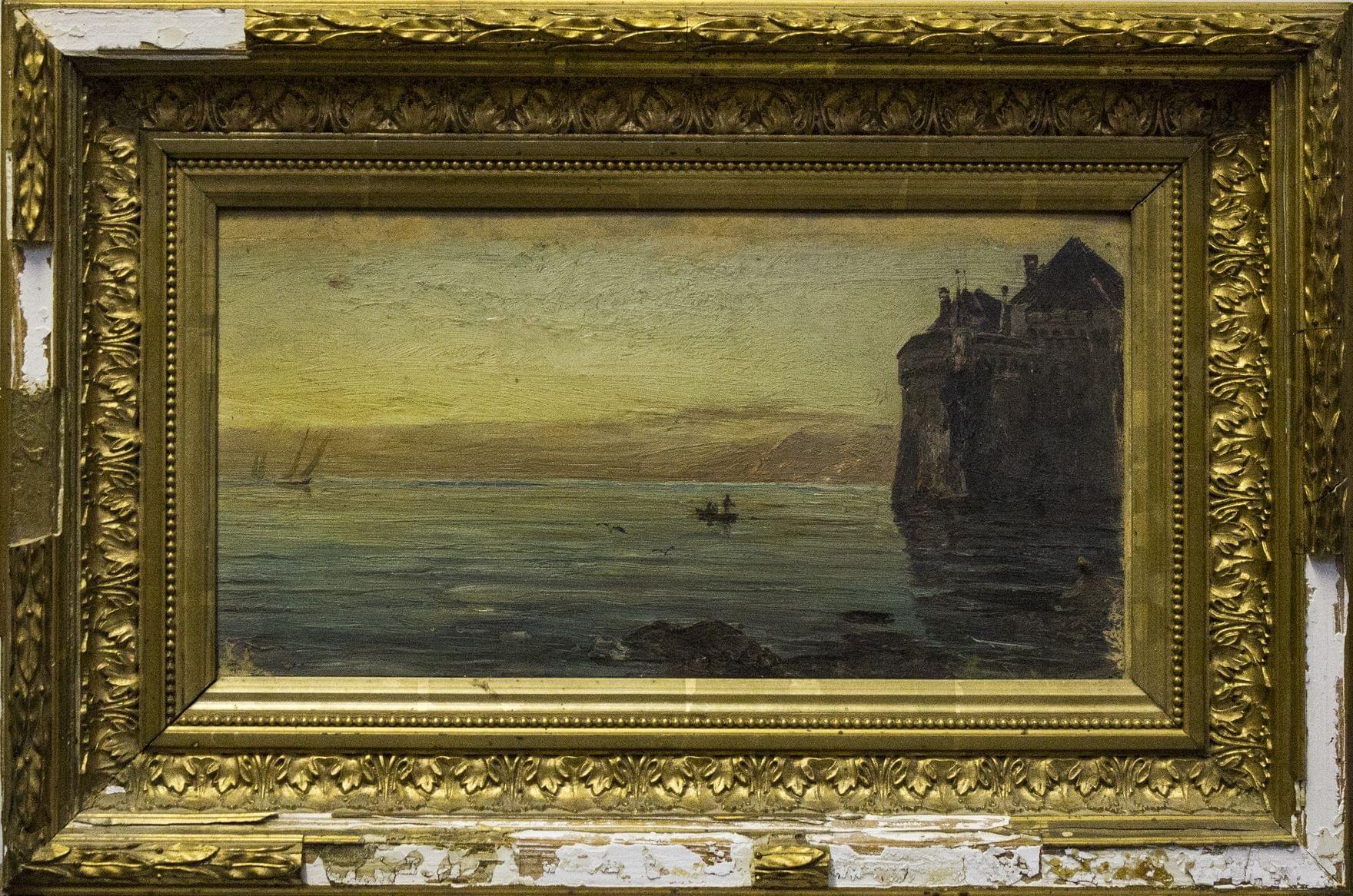 Château de Chillon et le lac, huile sur carton, authentifiée au dos, 18x32 cm