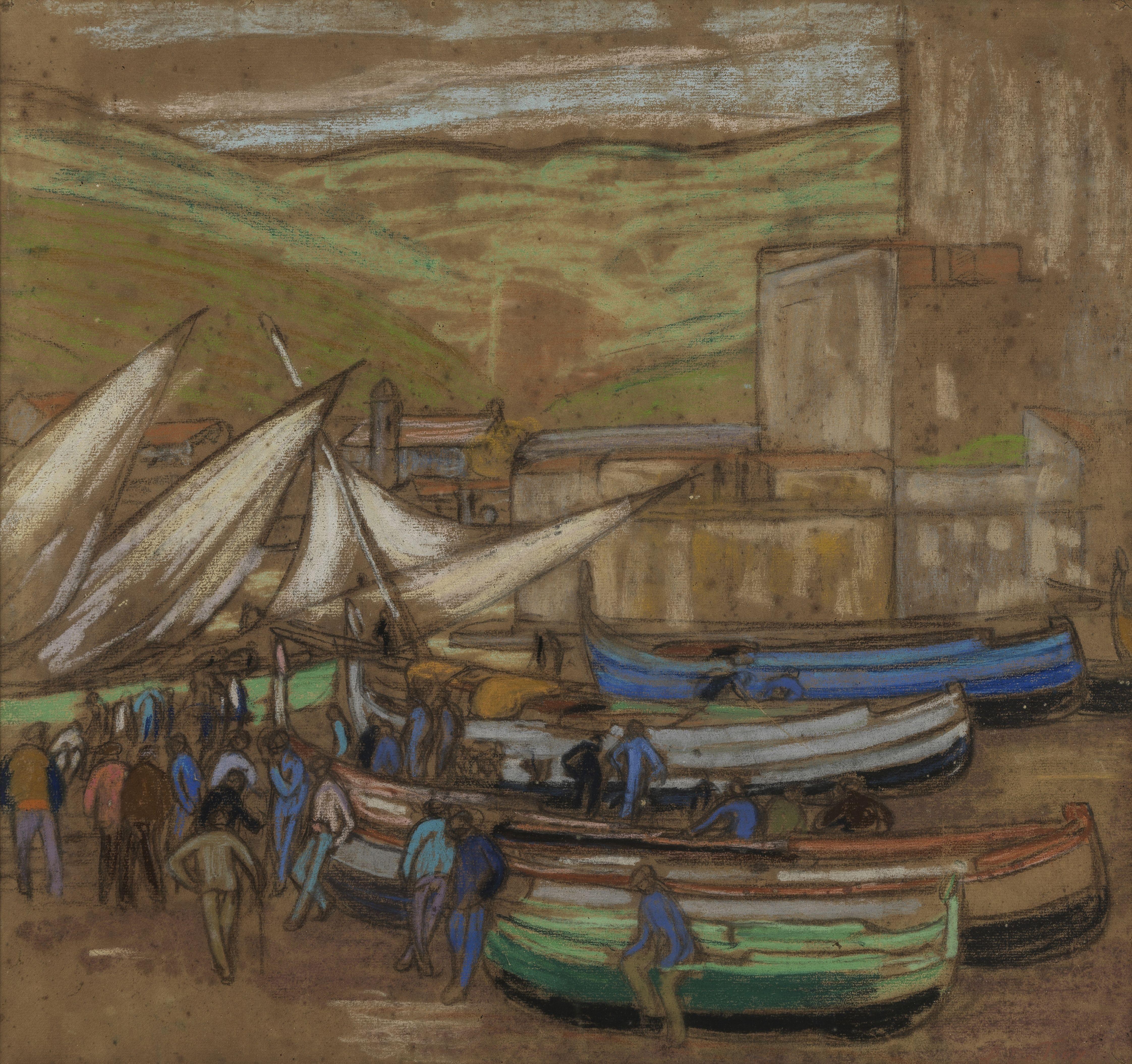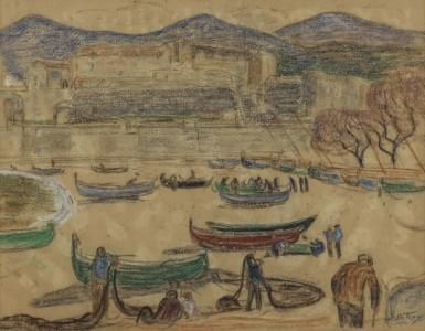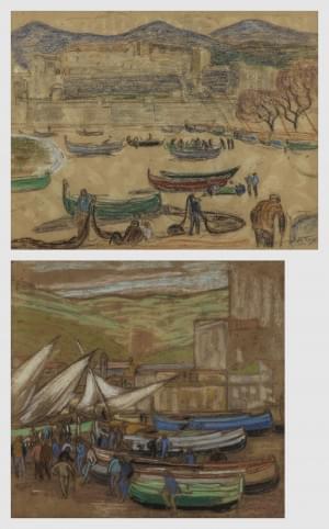 Etendage des filets sur la plage et Pêcheurs, pastels sur papier, 43x46 et 47x50 cm