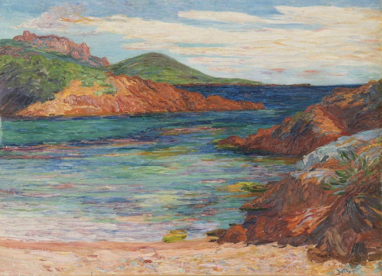 Vue sur le lac et montagnes au soleil couchant, huile sur toile...