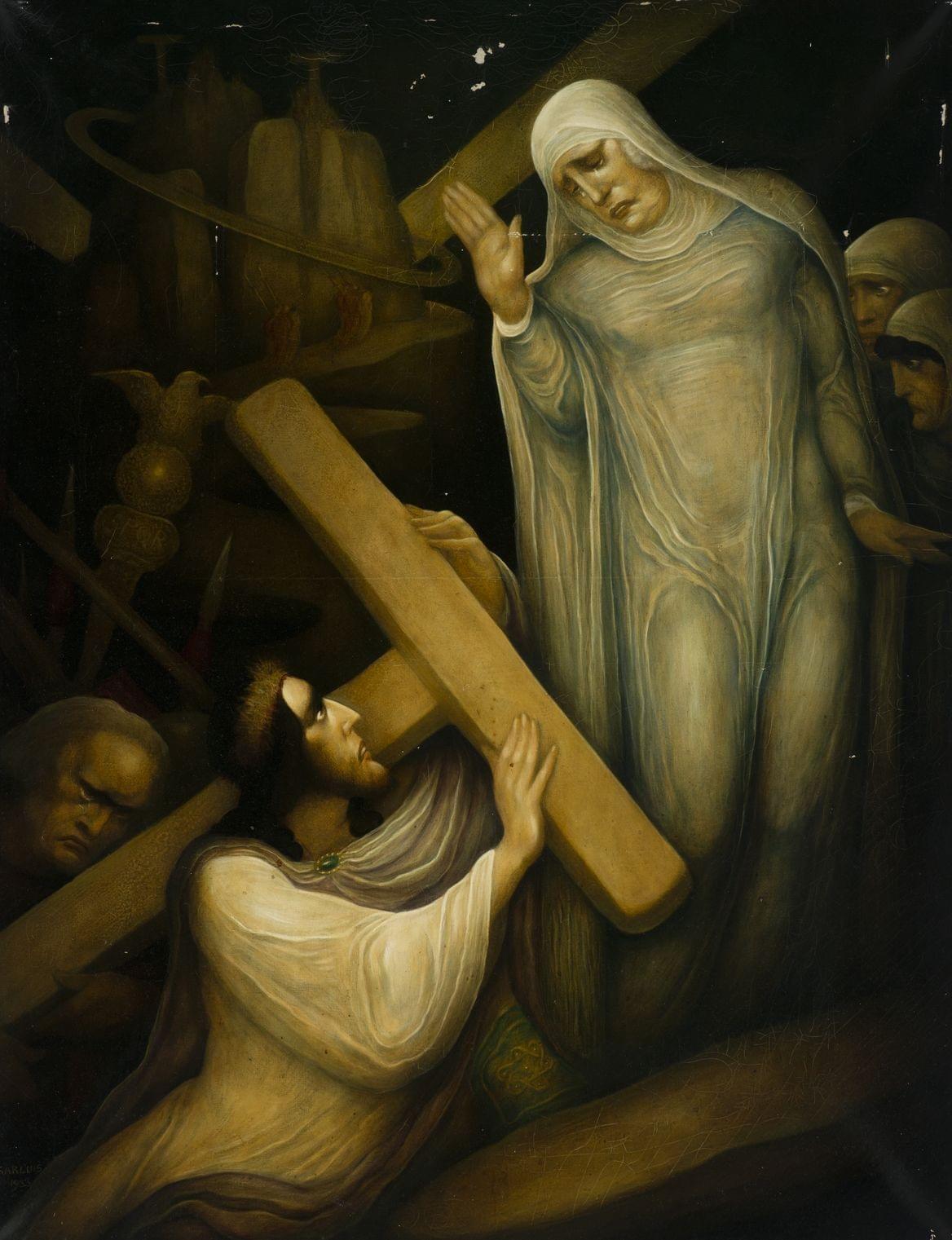 Le Christ rencontrant la Vierge Marie sur le chemin de croix, huile sur toile, signée et datée 1933, 100x76 cm