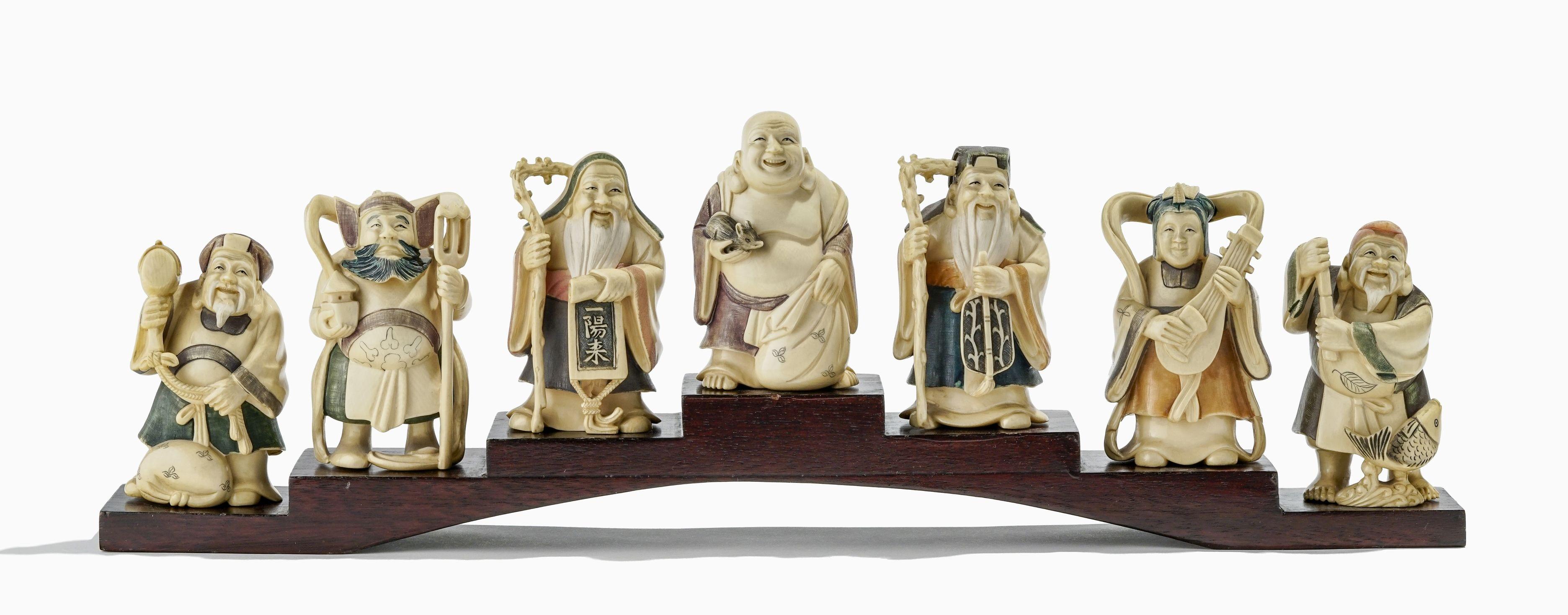 Suite de sept figurines en ivoire sculpté et gravé, H 11 cm