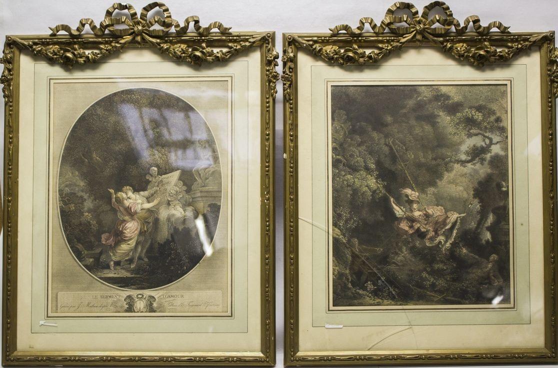 Deux gravures d'après Fragonard dans des cadres de style Louis XVI à décor de rubans et guirlandes, H 55 cm