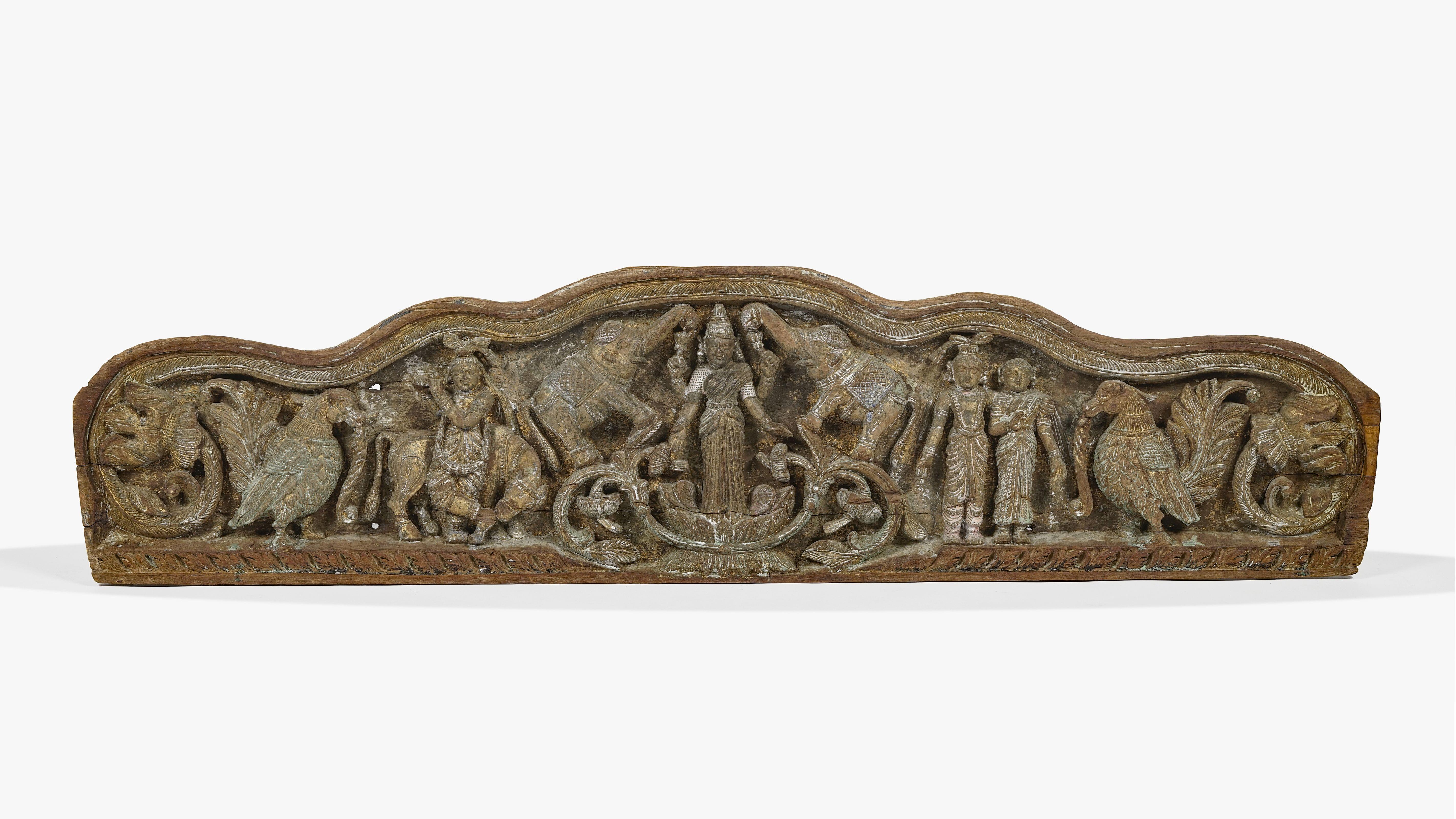 Frise avec des divinités hindoues, bois sculpté et doré, L 130 cm
