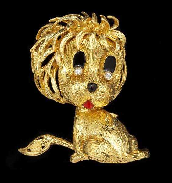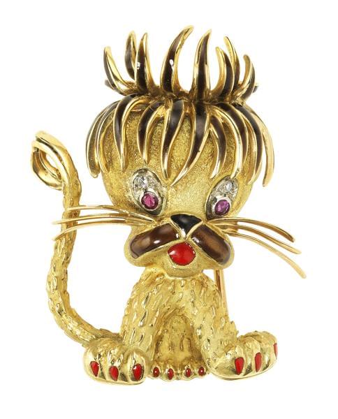3535. Broche à motif de lion ébouriffé émaillé aux yeux sertis de rubi...