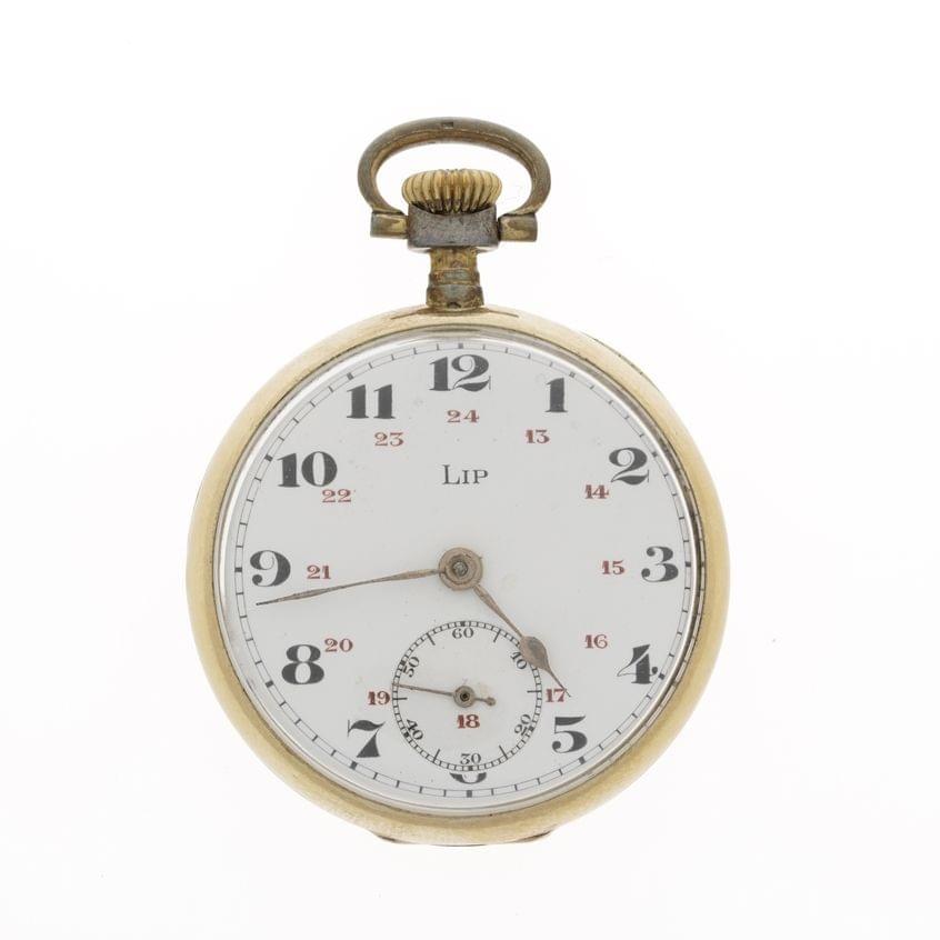 Cadran blanc, chiffres arabes bleus, aiguilles dorées, secondes à 6h, or 750, anneau en laiton, D 40 mm, poids brut 50 g