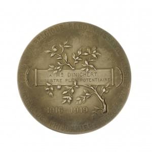 Dédicacée "La Belgique reconnaissante - Internement des prisonniers Belges en Suisse - 1916-1919 - à Mr Dinichert, ministre plénipotentiaire", D 7 cm, écrin.