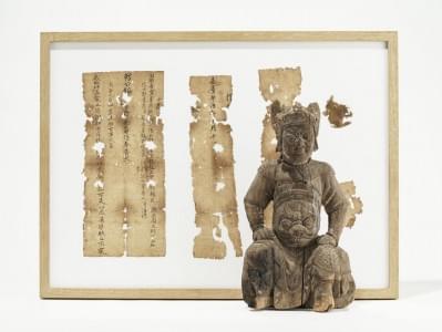 Bois sculpté, H 30 cm. On joint un manuscrit encadré