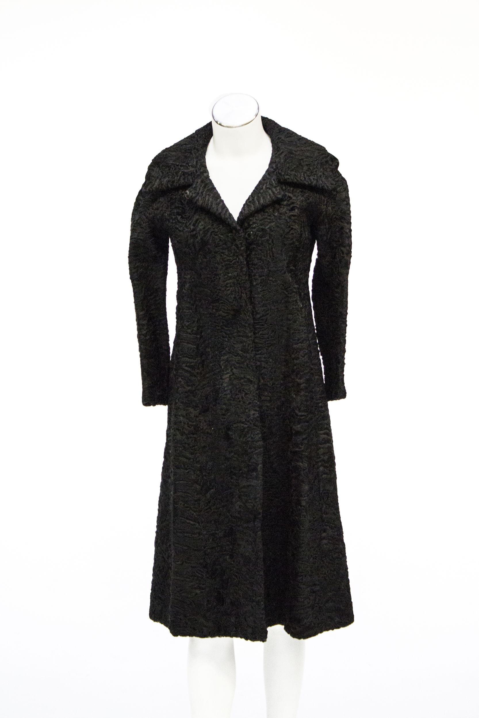 Astrakan noir, intérieur soie, poches latérales, fermetures à agraphes