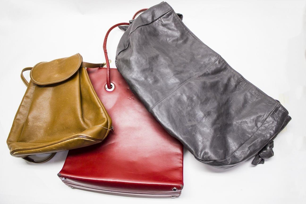 Sac à dos en cuir marron grainé, un sac type cabas en cuir rouge lisse et un cabas en cuir gris