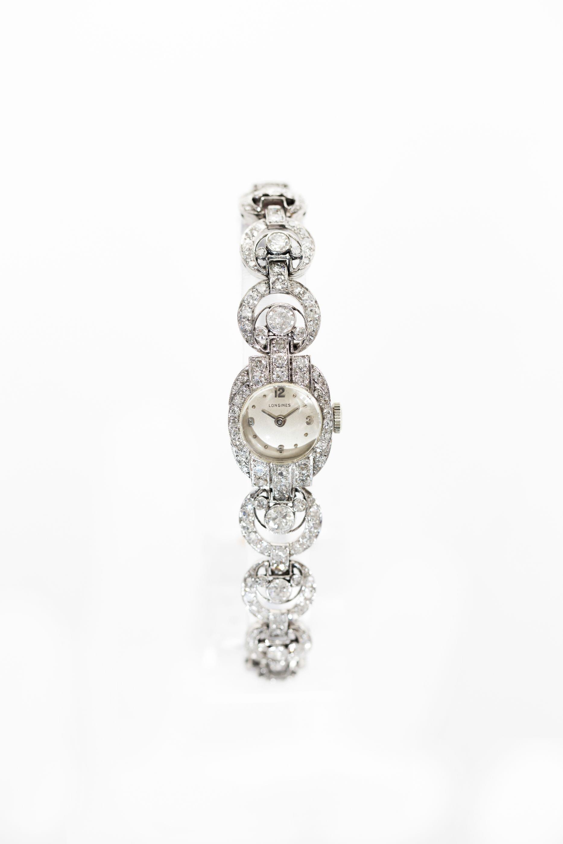 724. Longines, montre bracelet mécanique ovale sertie de diamants (env. 5 ct)