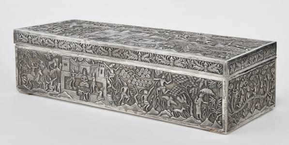 Argent repoussé à décor de scènes de chasse et de prière dans le...