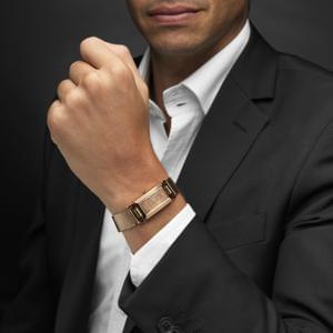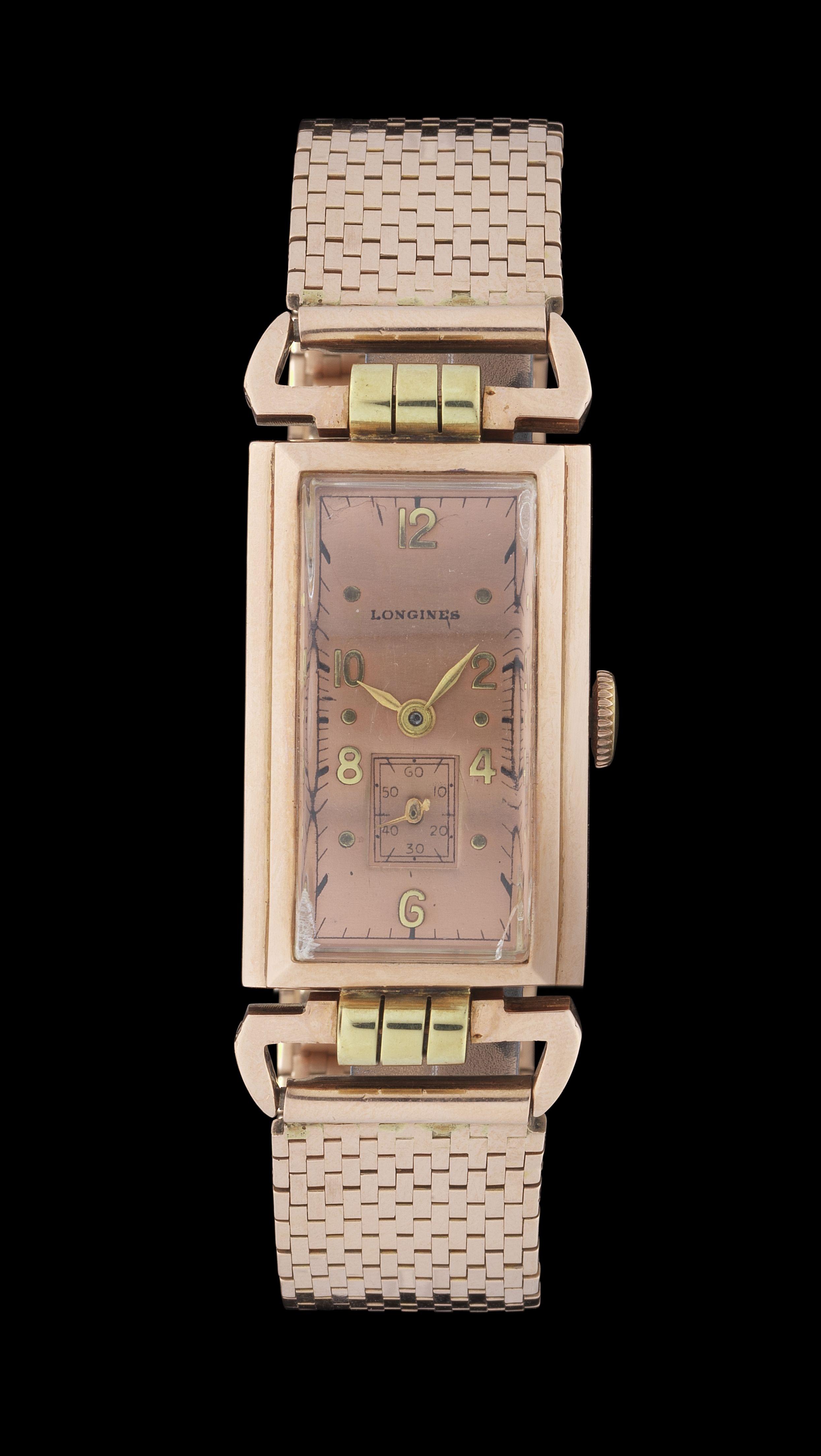Cadran cuivré, aiguilles et chiffres arabes dorés, verre facetté, bracelet non signé monogrammé J.R., or rose 585, 30x19 mm, poids brut 56 g