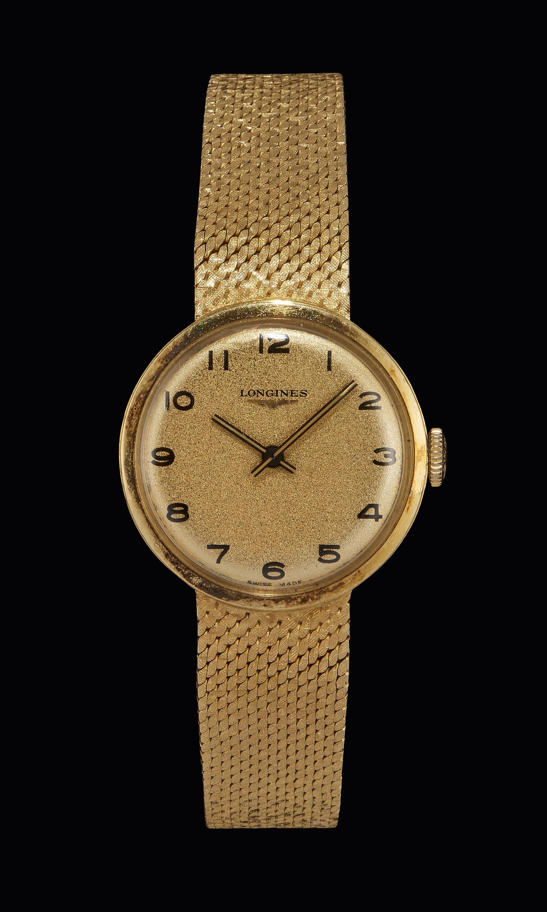 Cadran doré, aiguilles et chiffres arabes noirs, or 750, D 23 mm, L 17 cm, poids brut 44 g