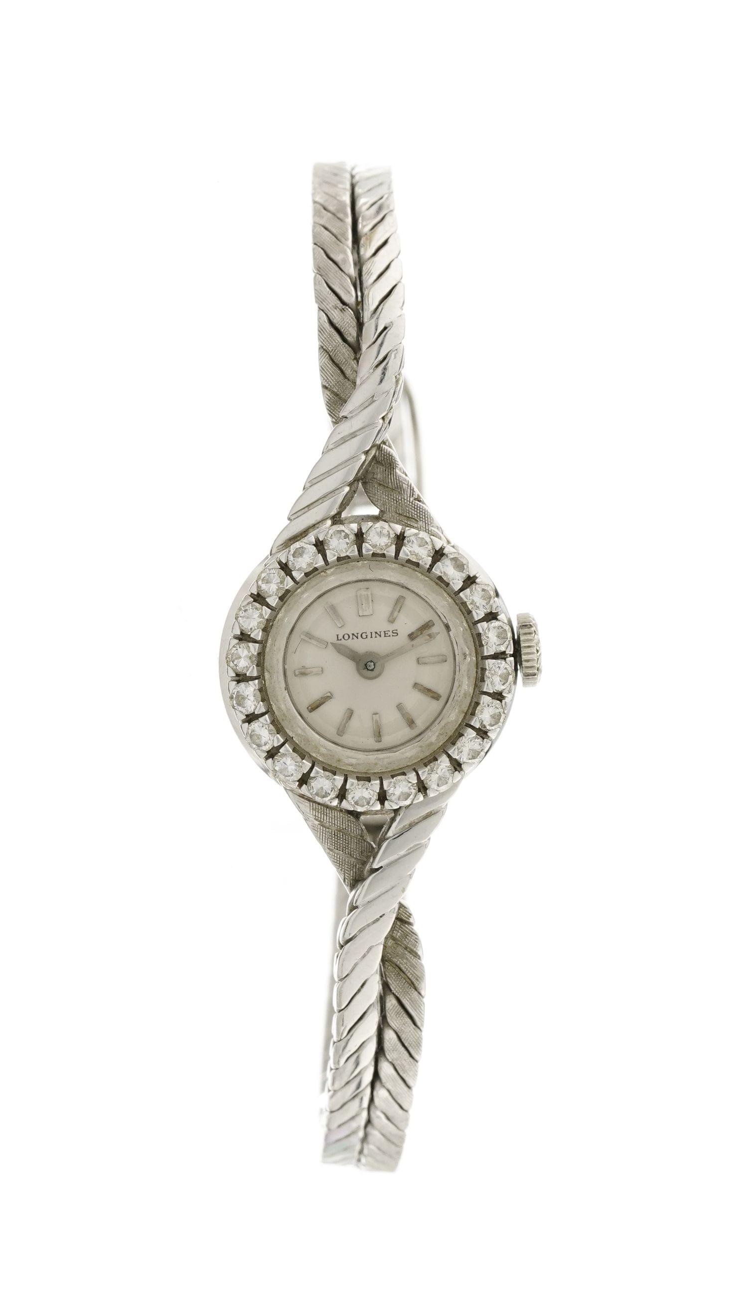 3043. Longines, montre bracelet ronde mécanique sertie de diamants