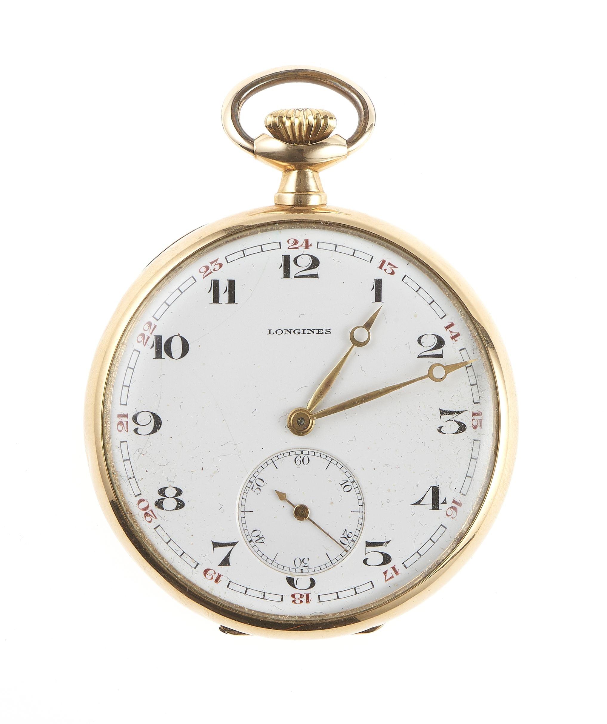 Cadran émaillé blanc, aiguilles dorées, chiffres arabes noirs, secondes à 6h, or 585, D 45 mm, poids brut 63 g