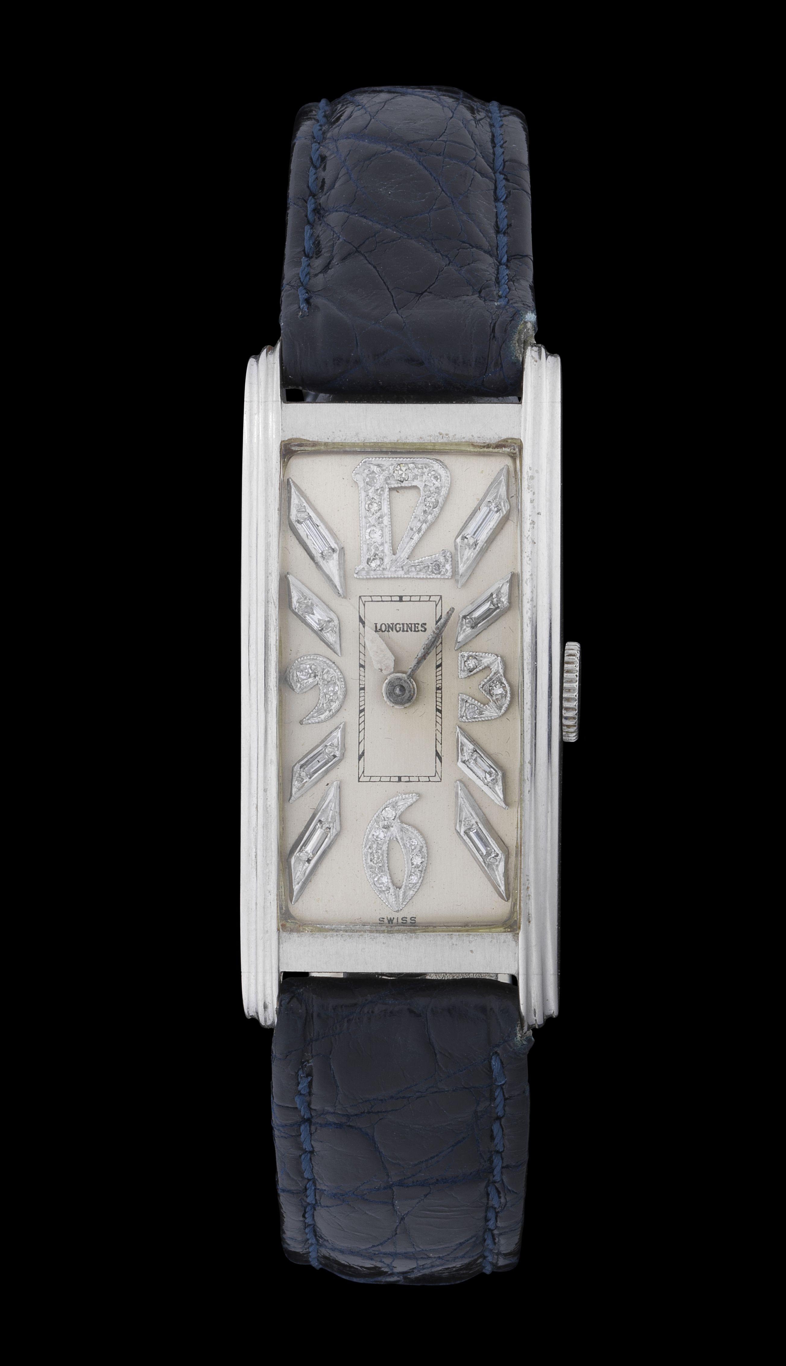 Cadran et aiguilles argentés, chiffres arabes et index sertis de diamants, platine et iridium, 41x19 mm, poids brut 33 g