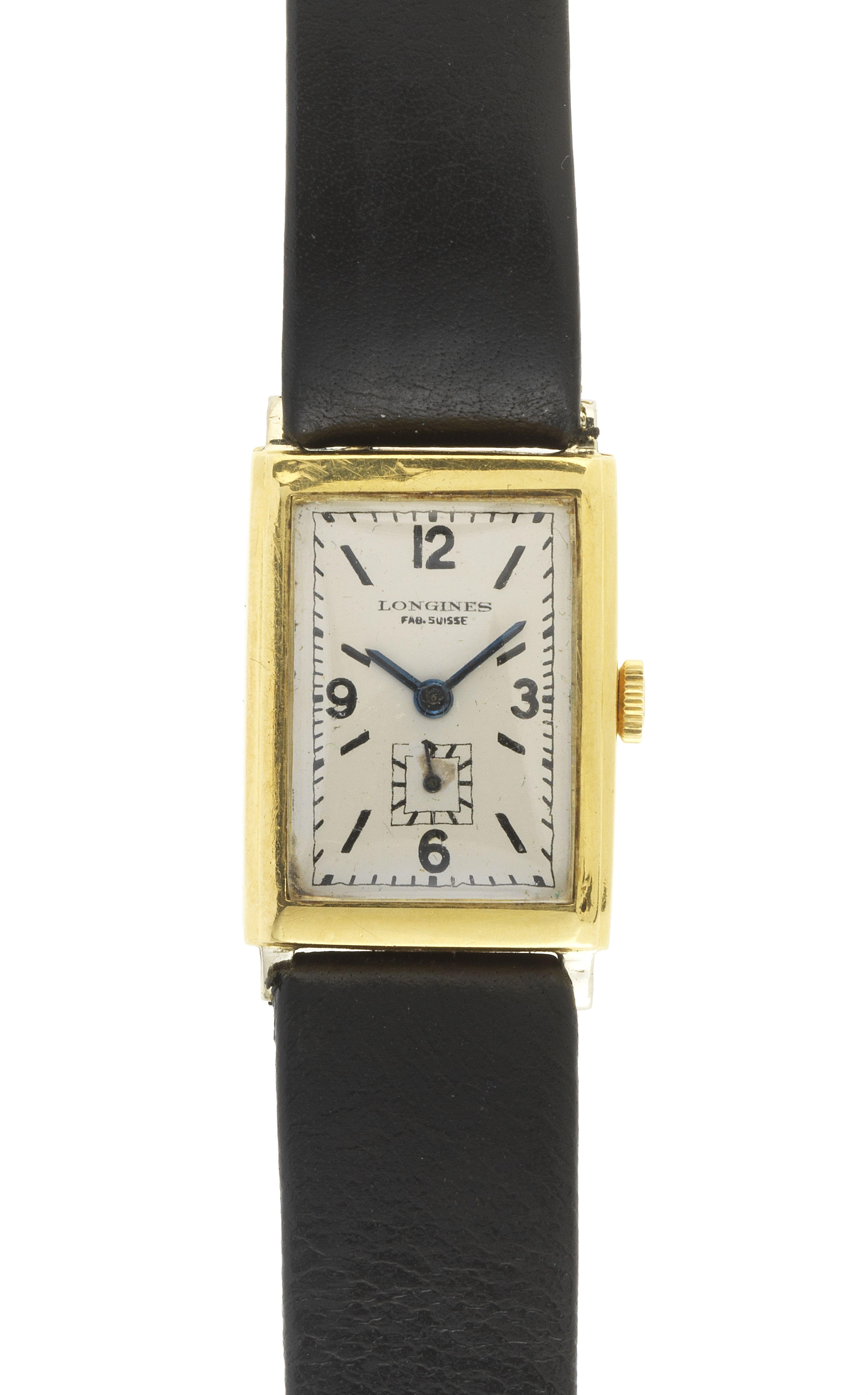 Cadran argenté, aiguilles bleuies, chiffres arabes noirs, secondes à 6h, or 750, 29x21 mm, poids brut 29 g