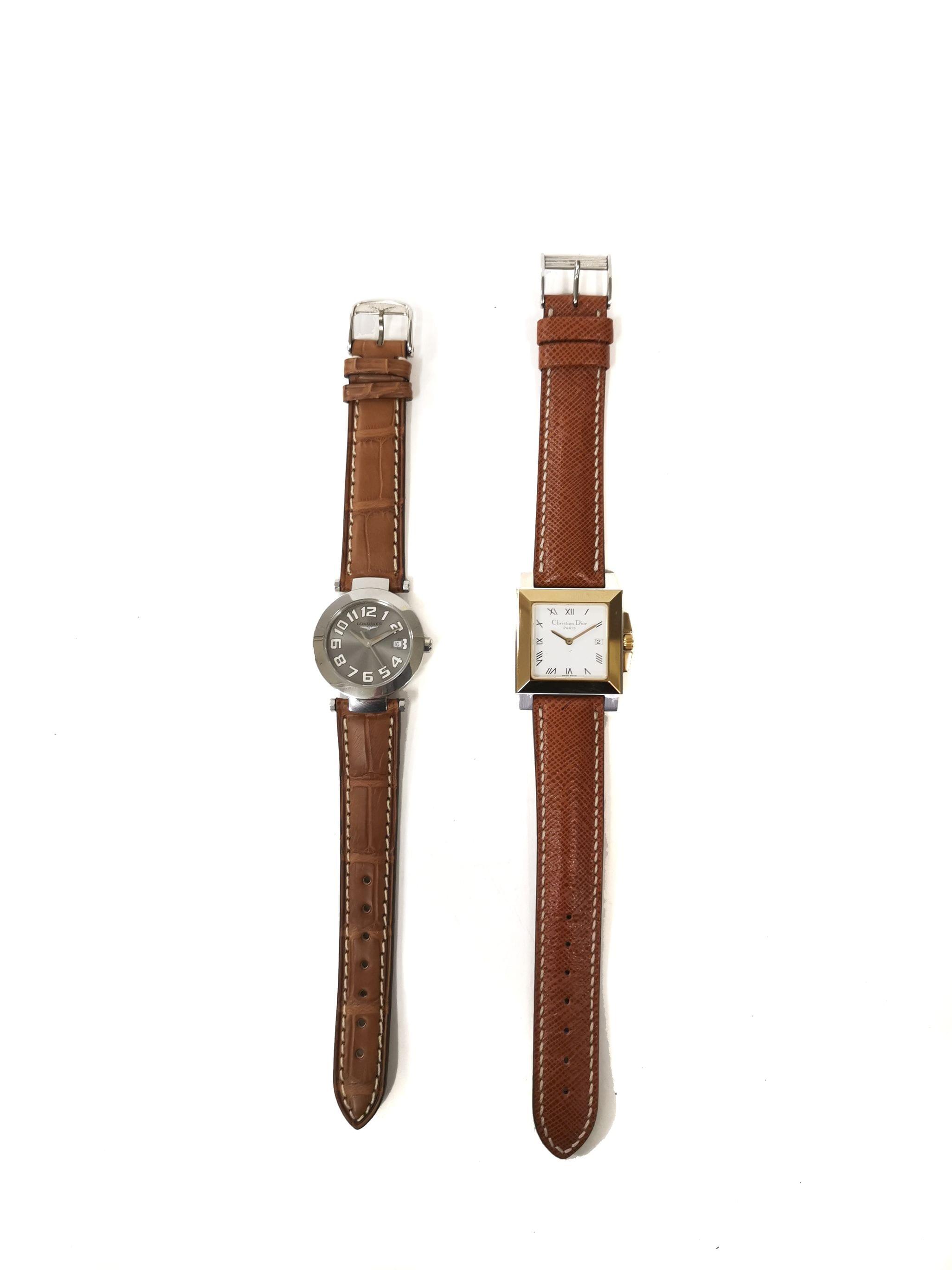 Cadran gris, aiguilles argentées, chiffres arabes luminescents, date à guichet à 3h, acier, D 28 mm. On joint une montre carrée à quartz Christian Dior, acier et métal doré, 27x27 mm.