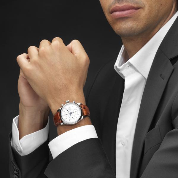 Cadran argenté, chiffres arabes noirs, aiguilles bleues, jour et date à guichet à 3h, éd. limitée, no 1899, bracelet marron en autruche, acier, D 40 mm