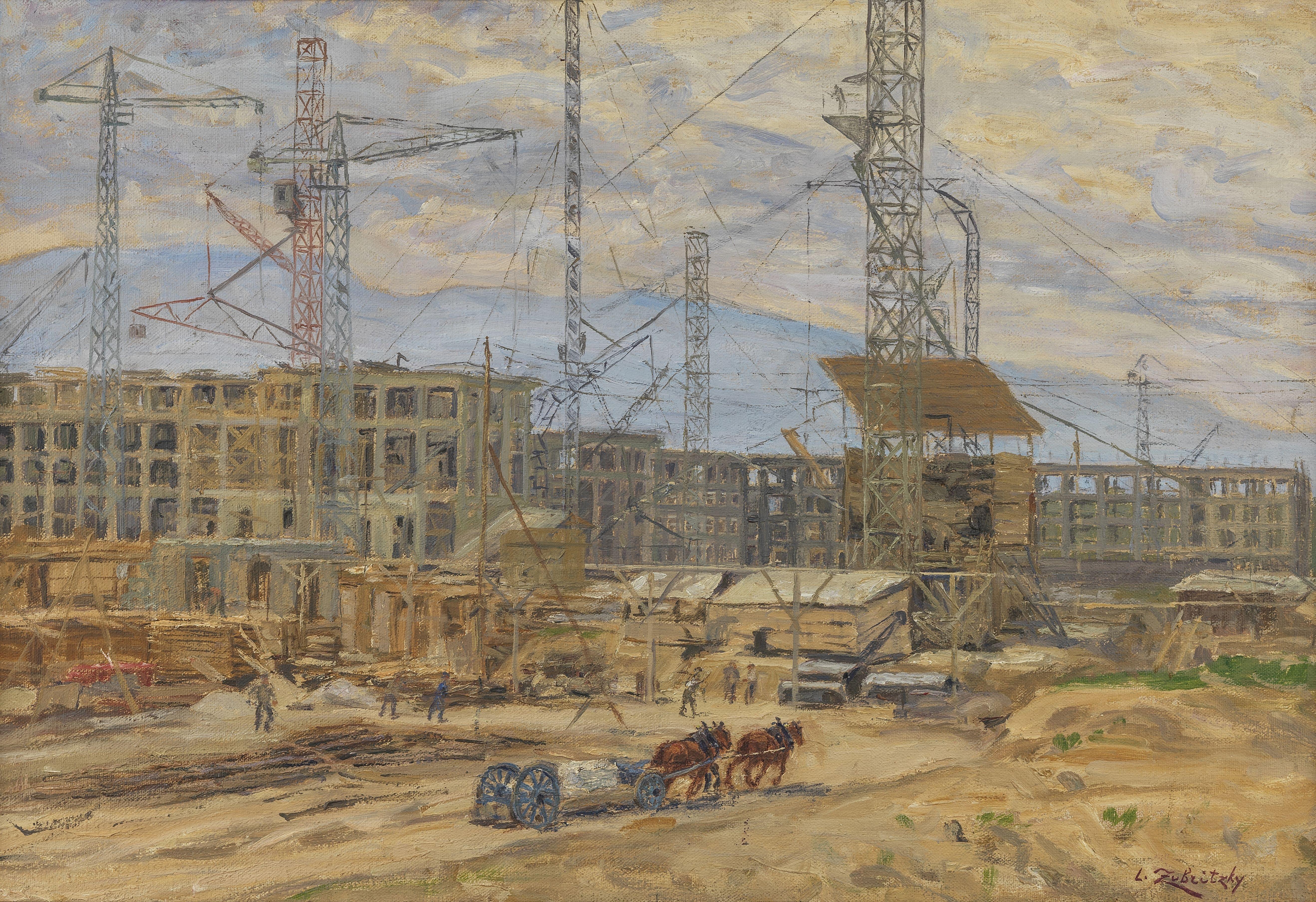 Travaux de construction du palais de la Société des Nations à Genève, 1932, huile sur toile, signée, 50x73 cm