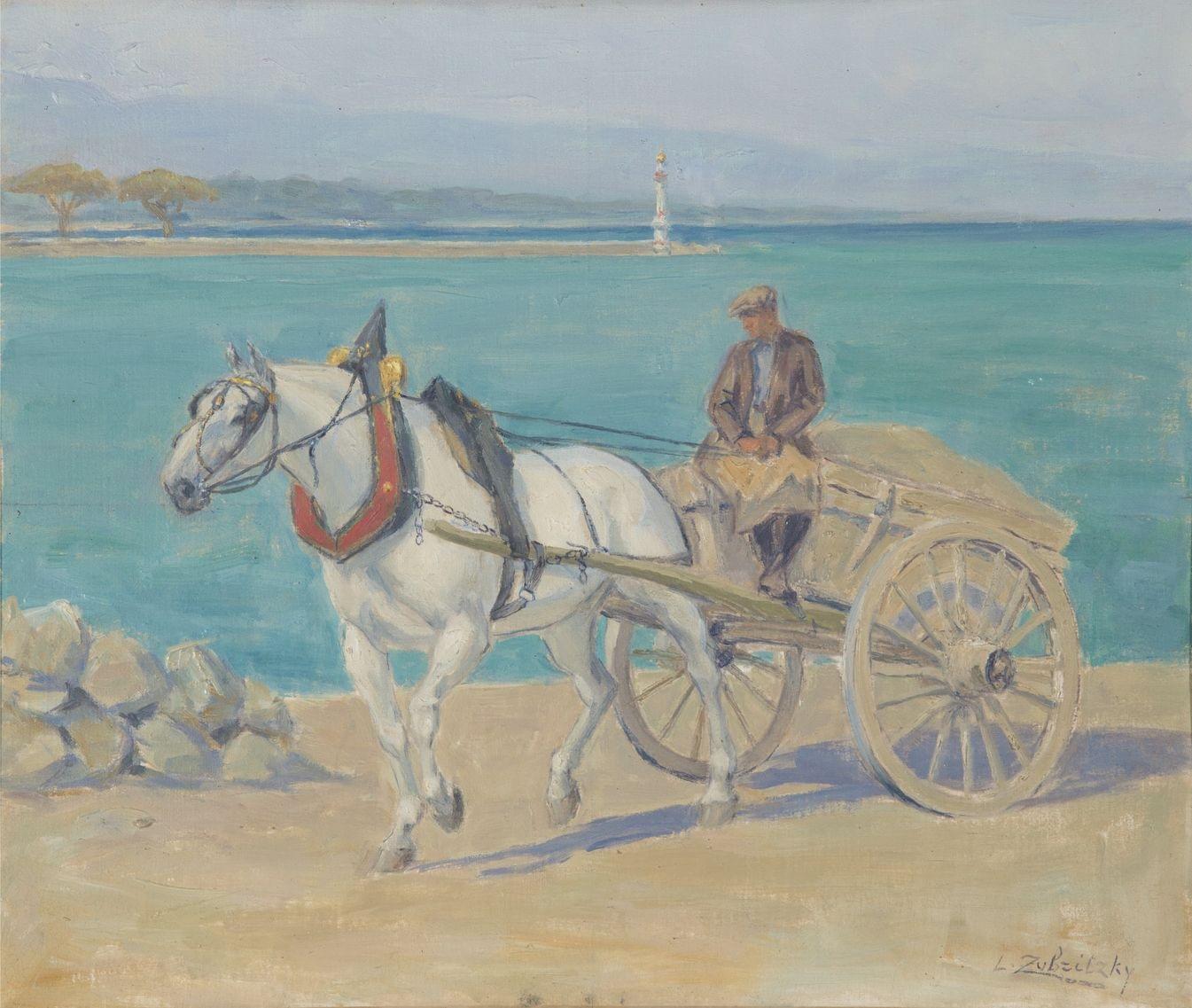Cheval de trait avec la jetée des Pâquis en fond, huile sur carton, 38x45 cm