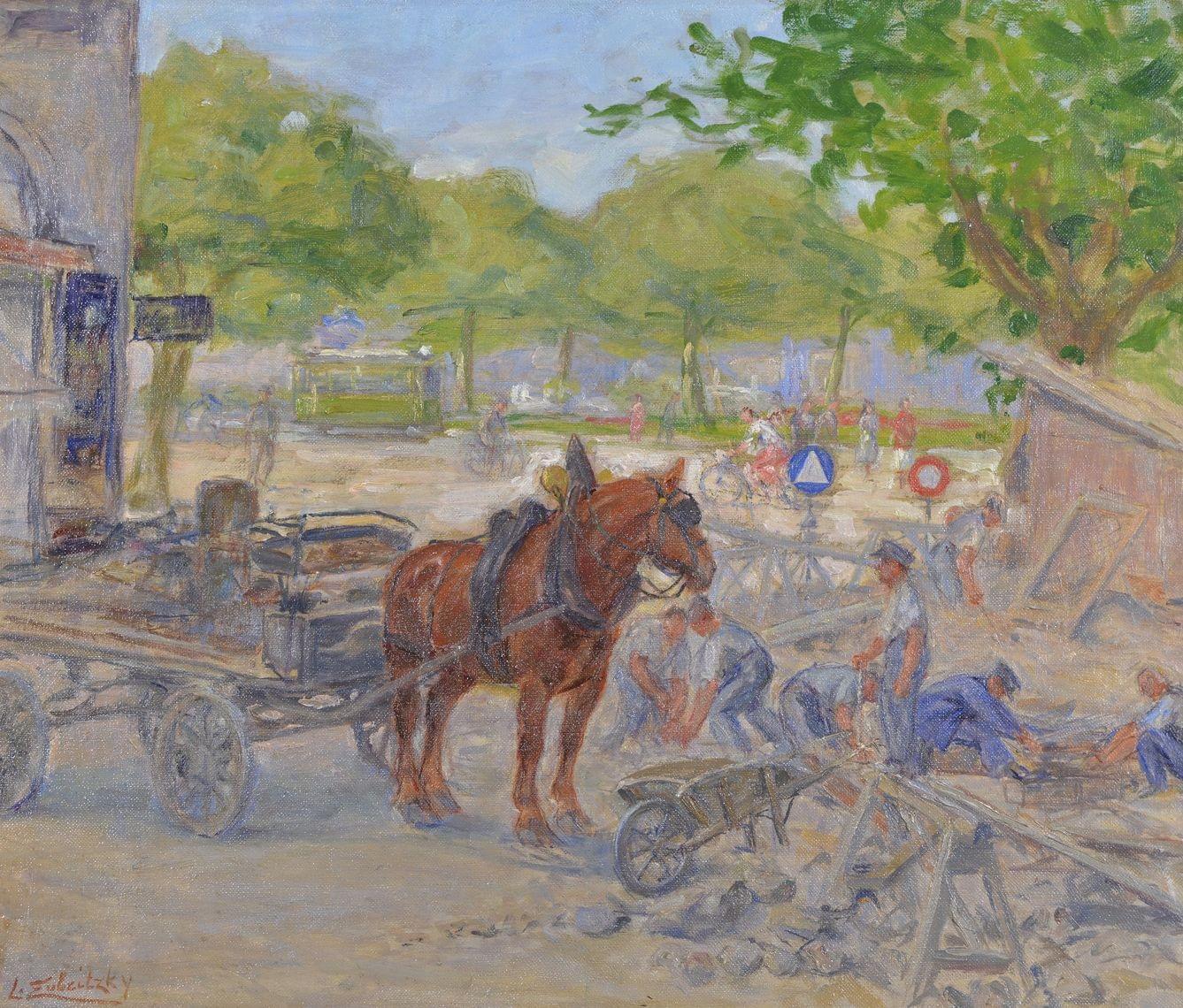 Travaux de voirie à Genève en 1943, huile sur toile signée, située et datée au dos, 46 x 56 cm