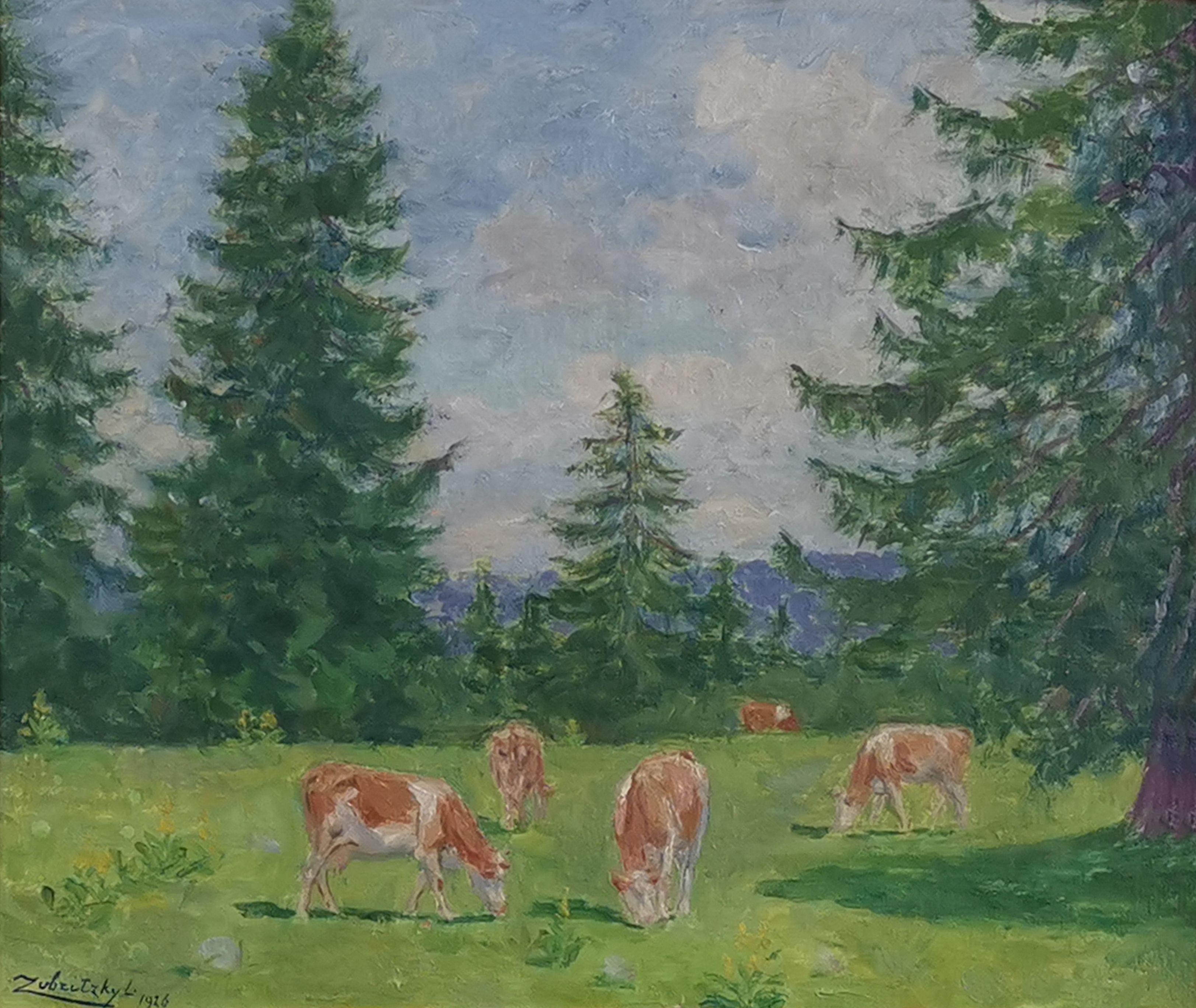 Paysage alpin avec des vaches, huile sur toile, signée et datée 1926, 38x46 cm