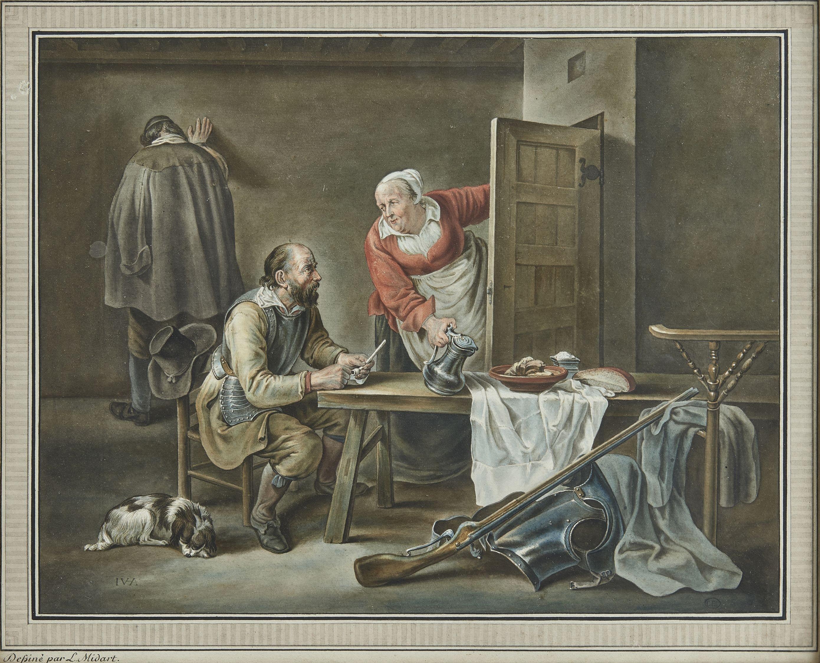 Scène d'intérieur, aquarelle et encre sur papier, cachet de collection de Charles Eggiman, 28x36 cm