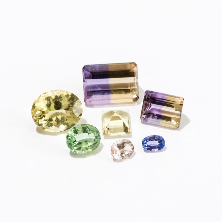 3145. Lot 7 pierres, 1 beryl héliodore couleur jaune de 5.30 ct, 1 tourmaline paraïba de 2,25 ct, 1 tourmaline rose de 0,6 ct et 1 tanzanite de 0,4 ct, 2 amétrines de 8 ct et 3ct, et un beryl héliodore de 1,9 ct