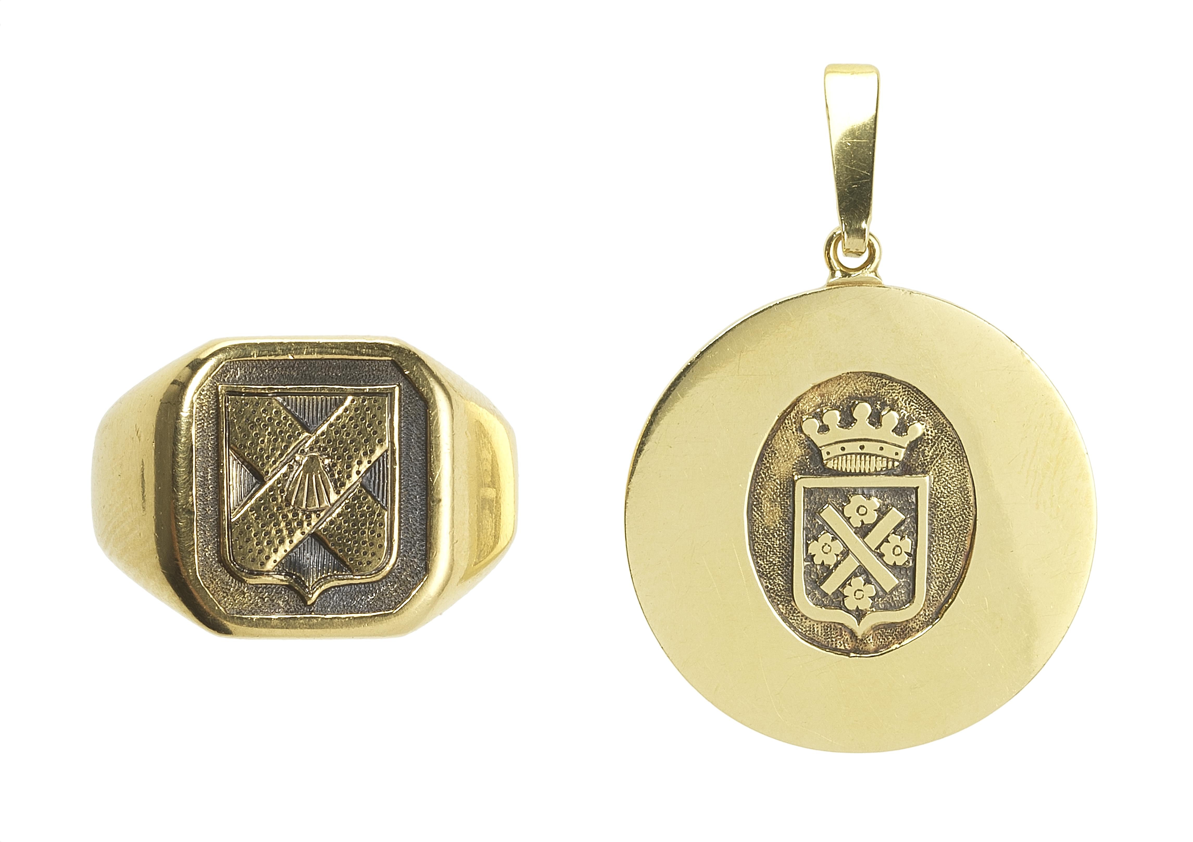 Une bague-chevalière octogonale centrée d'un blason à coquille Saint Jacques et une médaille centrée d'un blason à quatre fleurons rehaussé d'une couronne ducale, or 750, doigt 55-15, 23 g