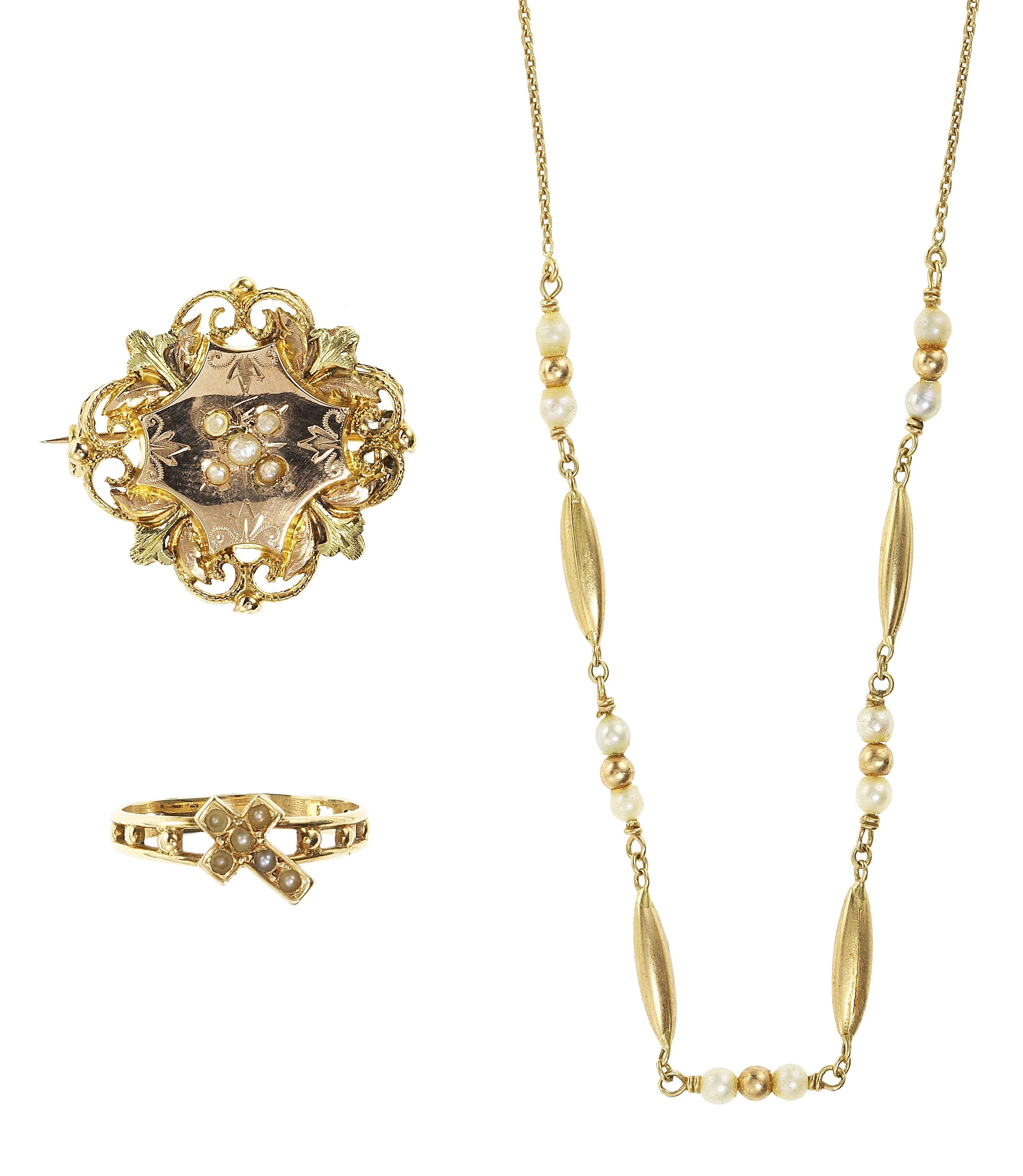Une chaîne tour de cou sertie de petites perles, une broche ajourée centrée de quatre demi-perles et une bague ajourée retenant un motif de croix sertie de demi-perles, travail français, or 750, L 41 cm, doigt 52-12, 6 g. Pour les lots précédés d'un *, la TVA de 7,7% est due sur l'entier du prix d'adjudication.