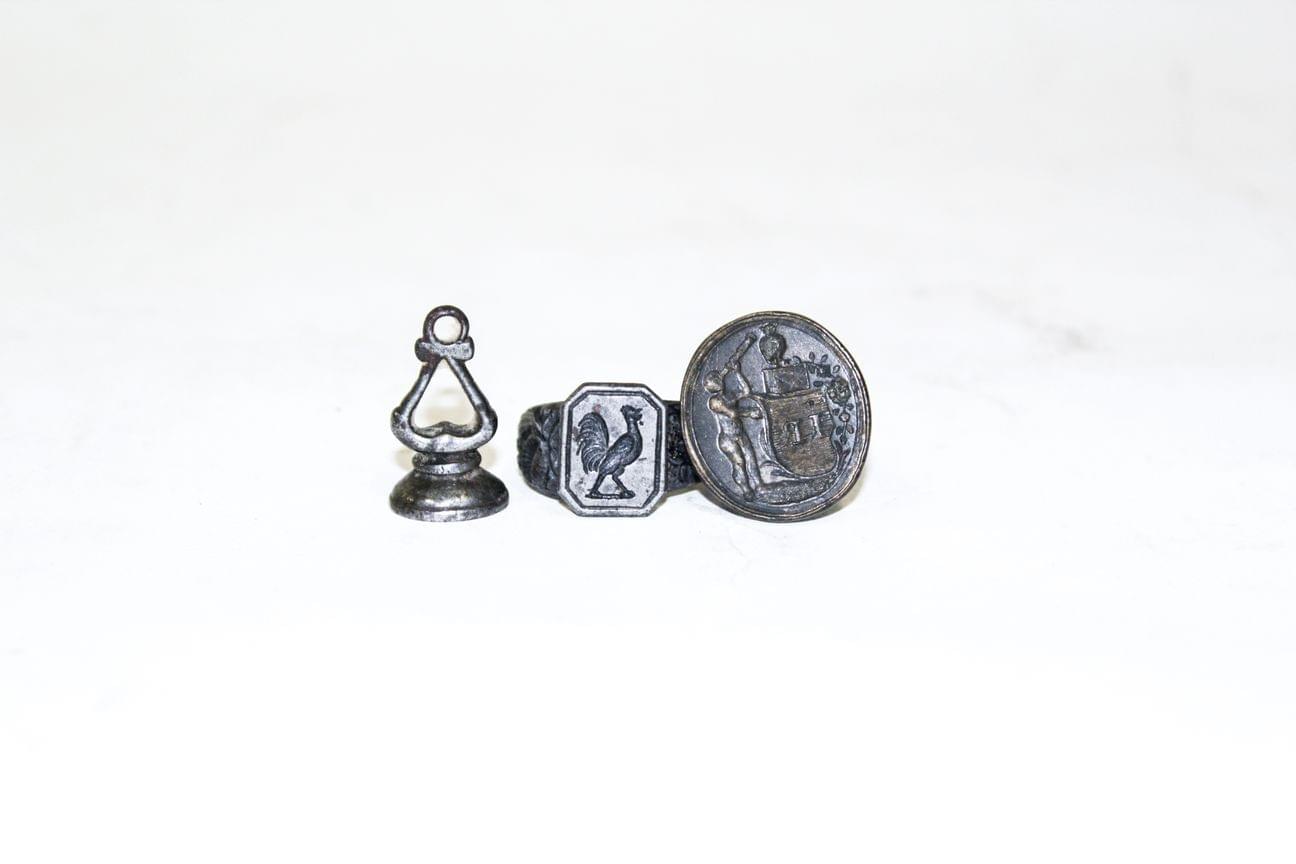 3154. Lot comprenant deux sceaux et une chevalière à motif de coq gravé en intaille