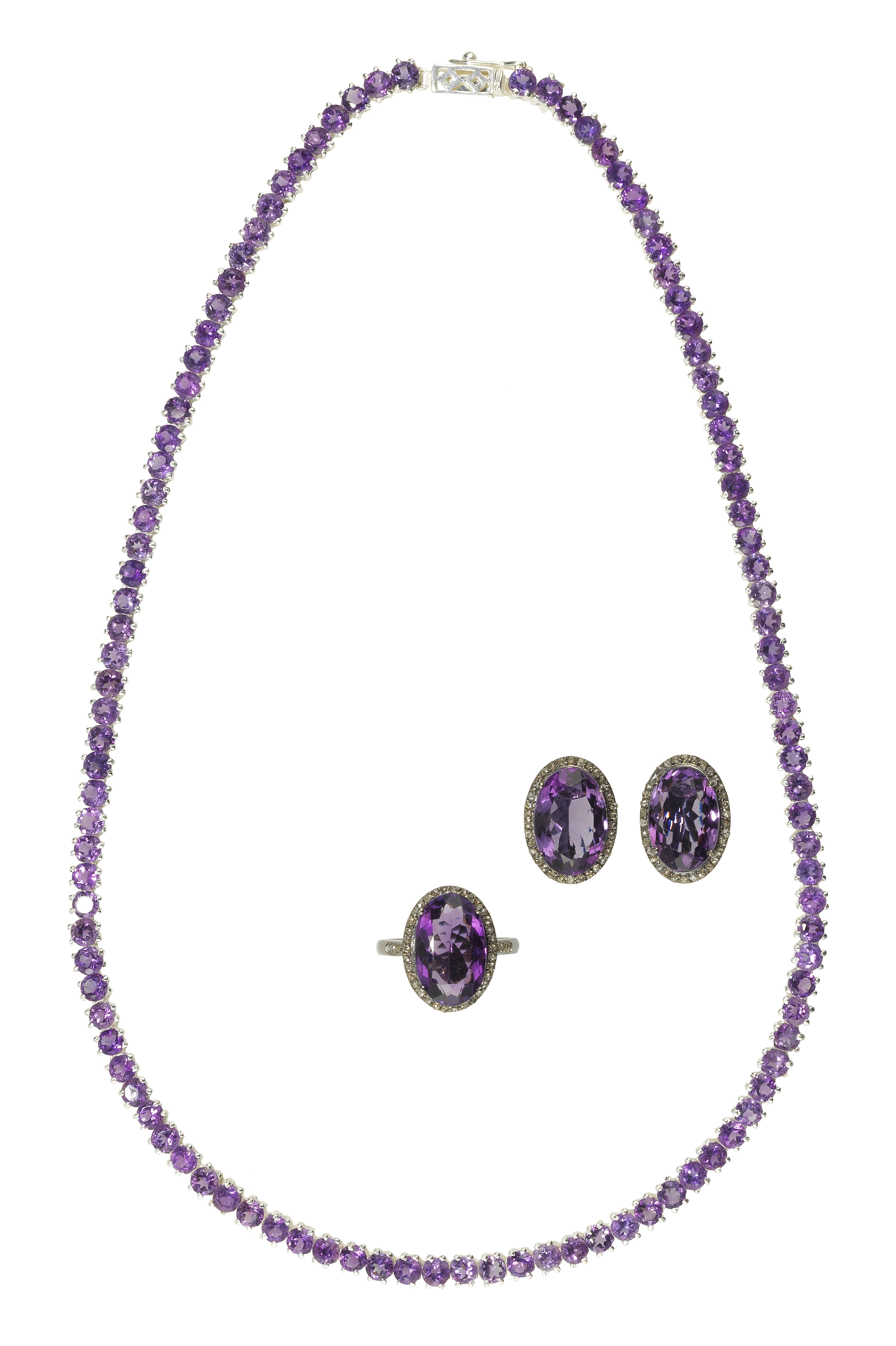 3349. *Lot comprenant un collier, une bague et une paire de boucles d'oreilles sertis d'améthystes