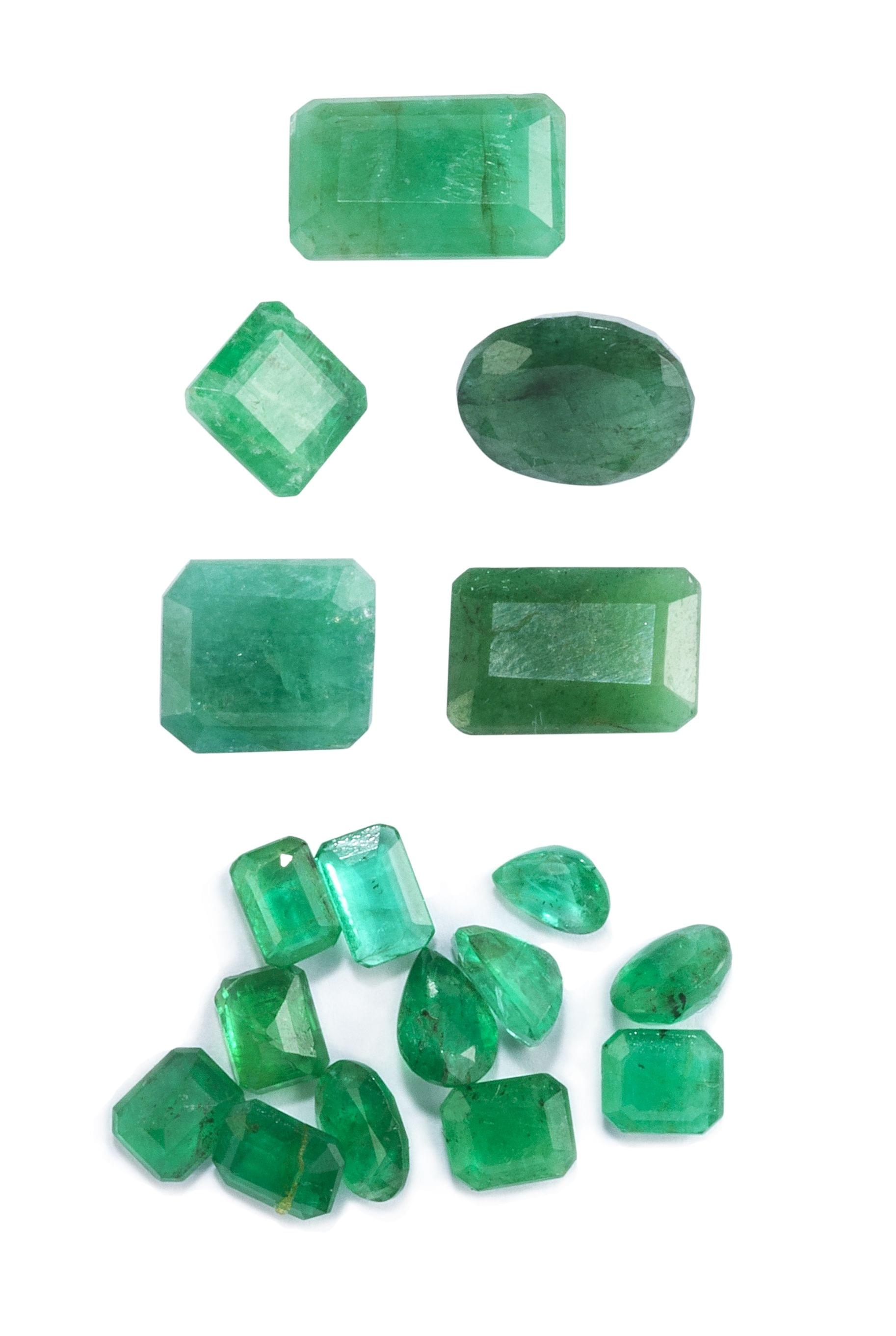 Une émeraude taille ovale (env. 4,1 ct), deux émeraudes taille rectangle (env. 4 et 4,4 ct), deux émeraudes octogonales (env. 1,8 et 5,5 ct) et un lot d'émeraudes de diverses tailles (total env. 7,6 ct). On joint un lot d'émeraudes brutes (total env. 990 ct). Pour les lots précédés d'un *, la TVA de 7,7% est due sur l'entier du prix d'adjudication.