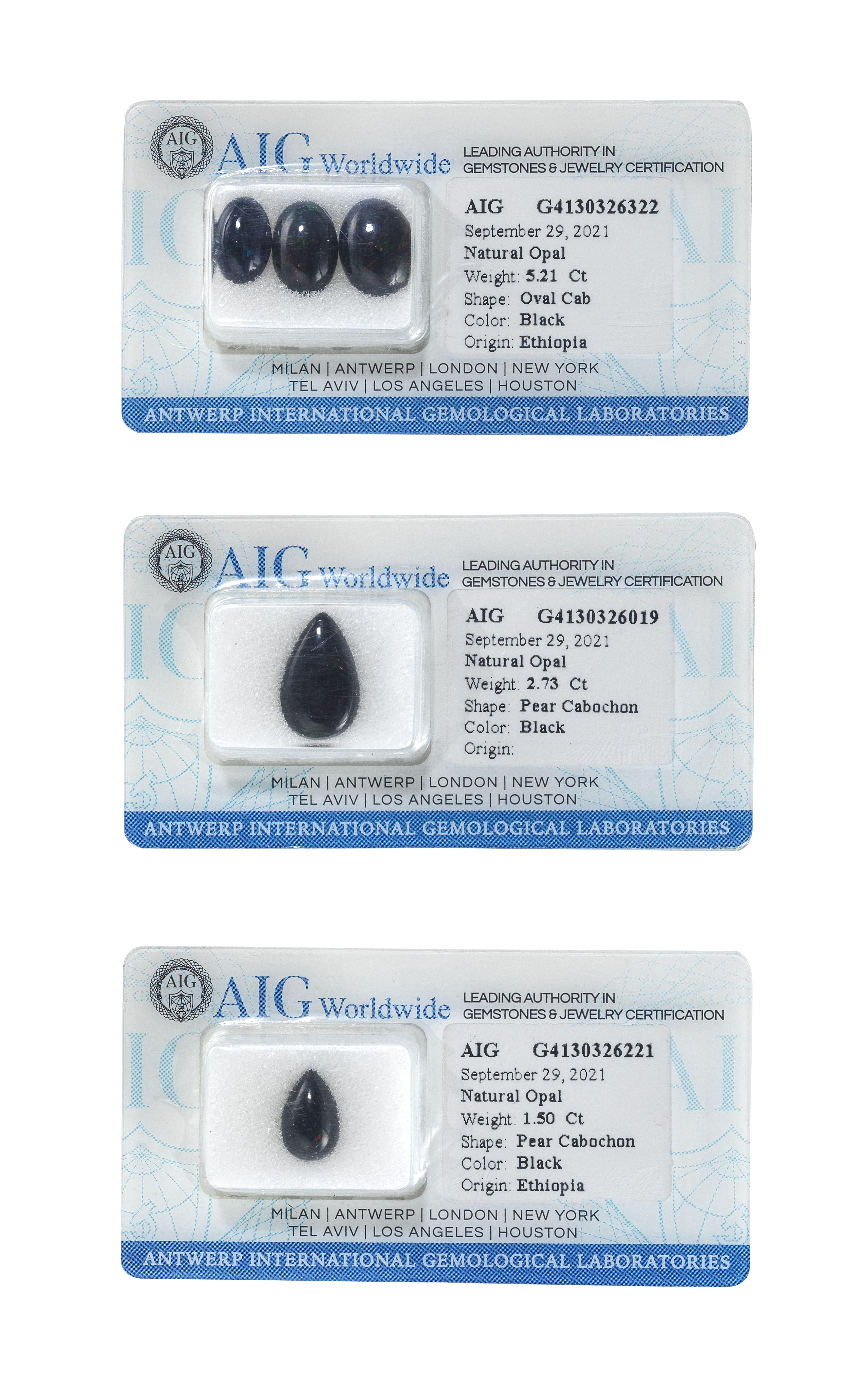 Deux tailles cabochon poire (2,73 et 1,5 ct) et un lot de trois opales taille cabochon (total 5,21ct). Pour les lots précédés d'un *, la TVA de 7,7% est due sur l'entier du prix d'adjudication.