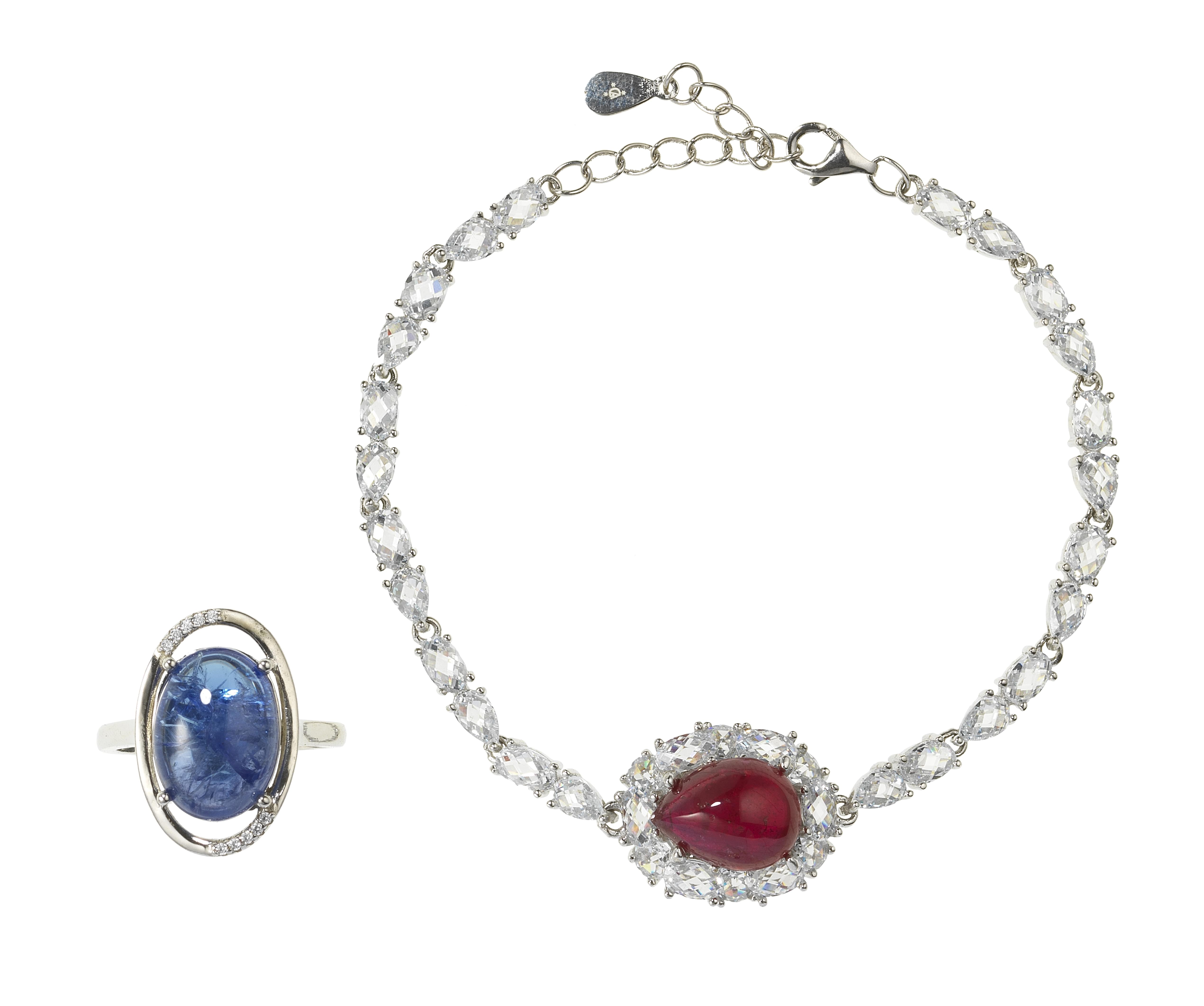Le premier centré d'un motif serti d'un rubis taille cabochon poire entouré de topazes blanches facettées, la seconde sertie d'une tanzanite taille cabochon ovale rehaussée de pierres d'imitation pour le diamant, argent 925, L entre 16,5 et 19,5 cm, doigt 54-14. Pour les lots précédés d'un *, la TVA de 7,7% est due sur l'entier du prix d'adjudication.