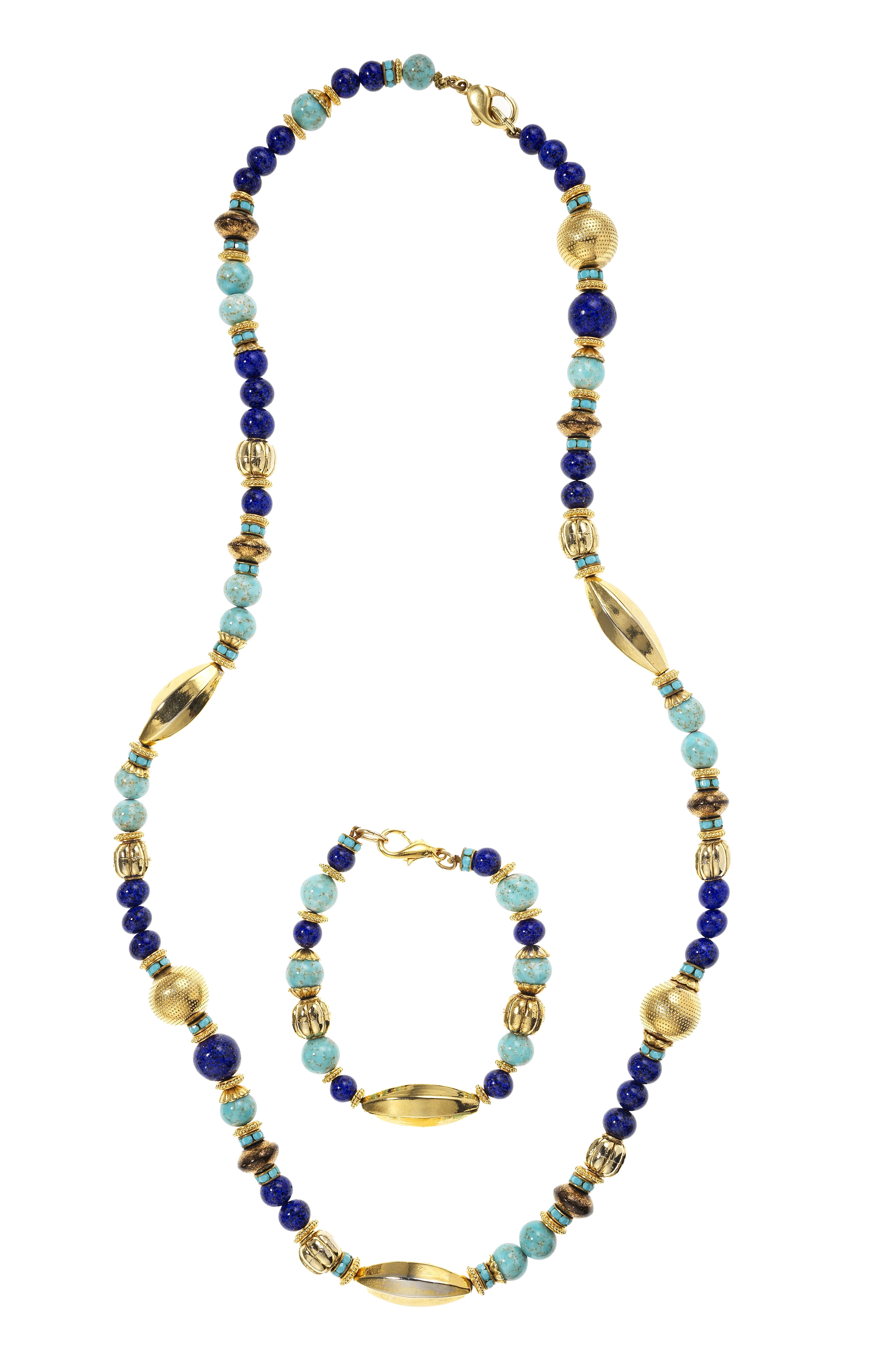 3048. Lot d'un collier et d'un bracelet sertis de perles de turquoise, de lapis-lazuli et d'éléments dorés