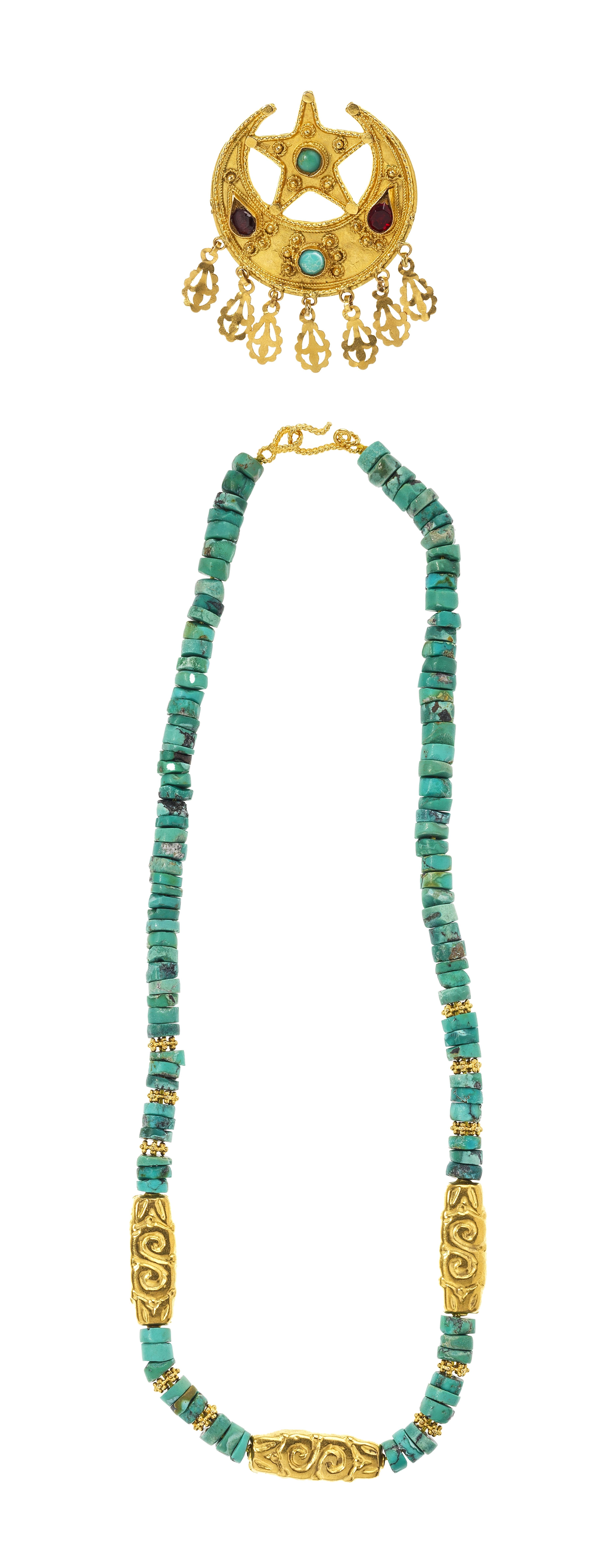 L'un composé de perles de turquoise et ponctué de motifs ciselés, le second à décor d'un croissant oriental serti de turquoises et pierres d'imitation pour le rubis, or 750, L 44 cm, H 5 cm, poids brut 42 g