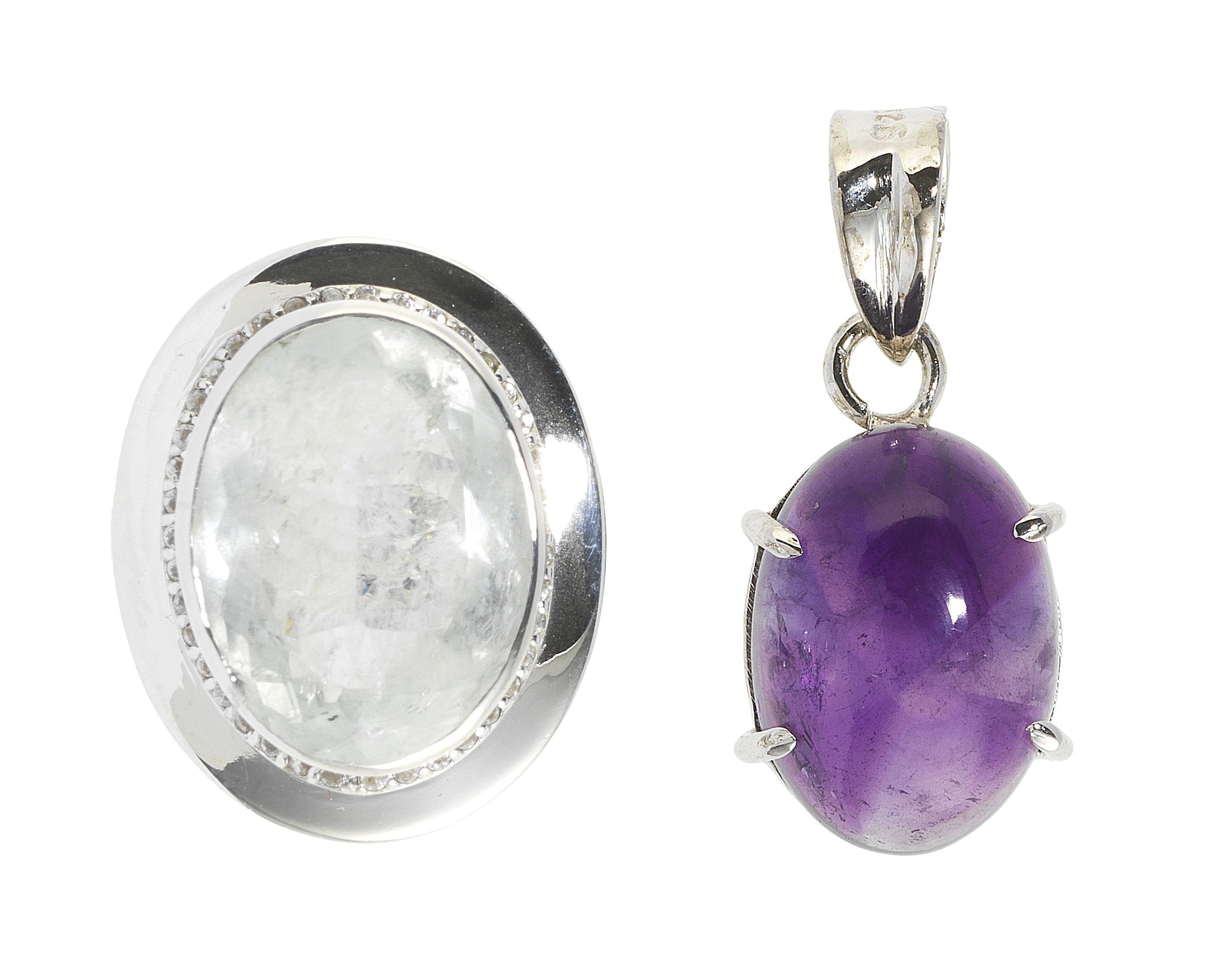 La bague sertie d'une aigue-marine taille ovale (env. 12 ct) entourée de topazes blanches et le pendentif serti d'une améthyste taille cabochon ovale, argent 925, doigt 57-17, H 3 cm. Pour les lots précédés d'un *, la TVA de 7,7% est due sur l'entier du prix d'adjudication.