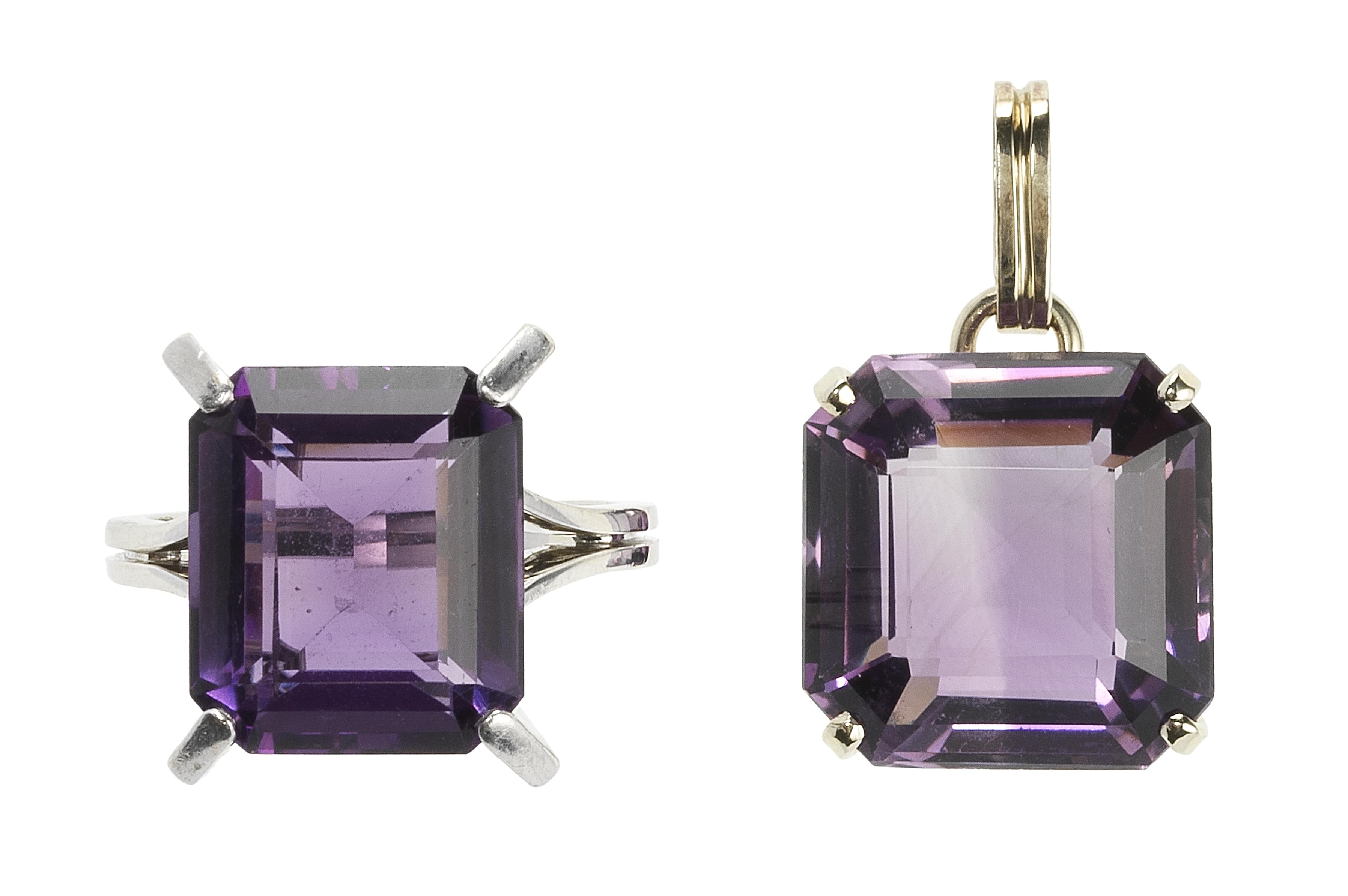 Sertis chacun d'une améthyste taille rectangle (env. 8,5 ct) et carré (env. 12 ct), or gris 750, doigt 54-14, H 2,5 cm, poids brut 11 g