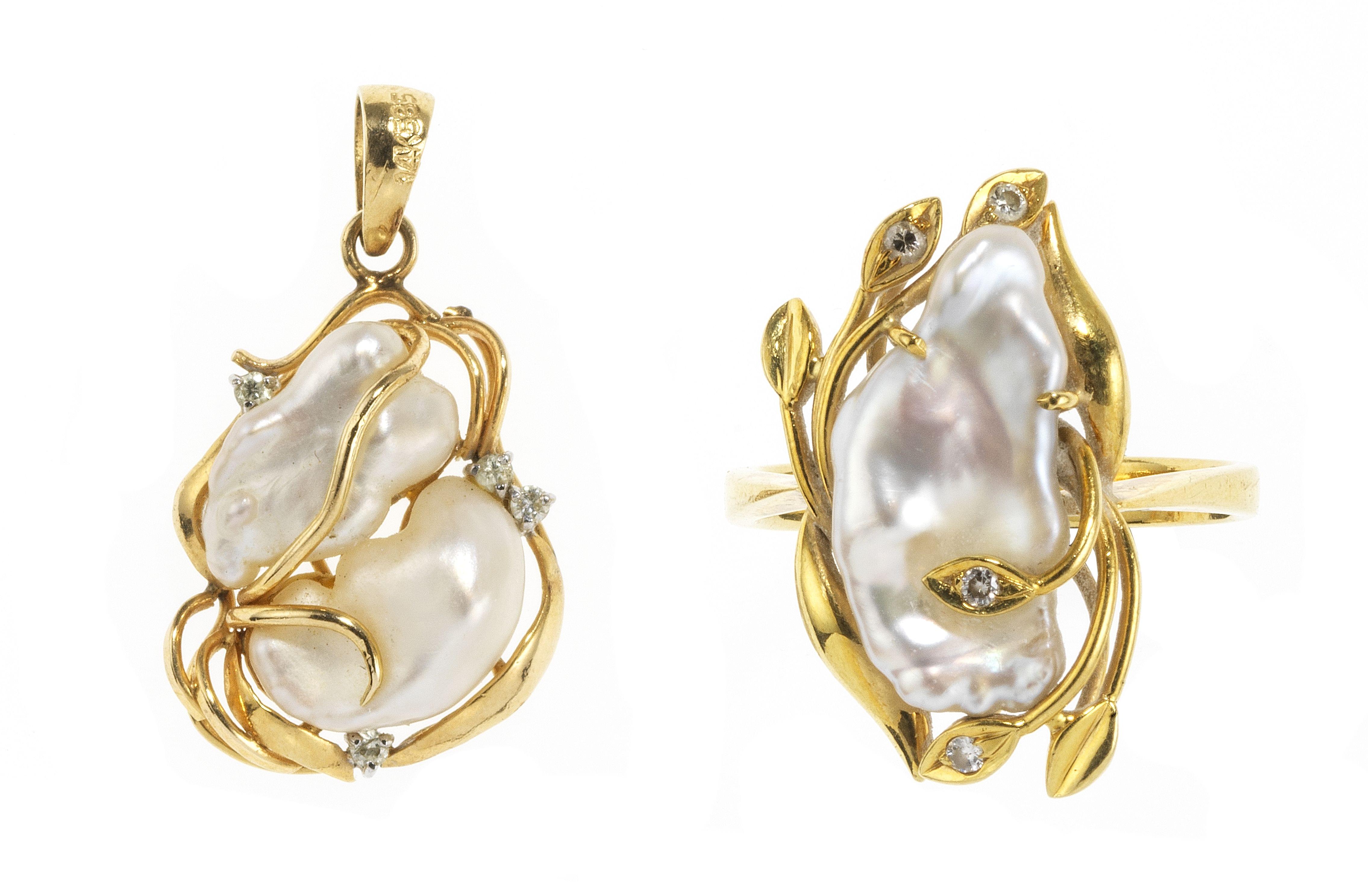 3124. Lot d'une bague et d'un pendentif sertis de perles de nacre rehaussées de petits diamants