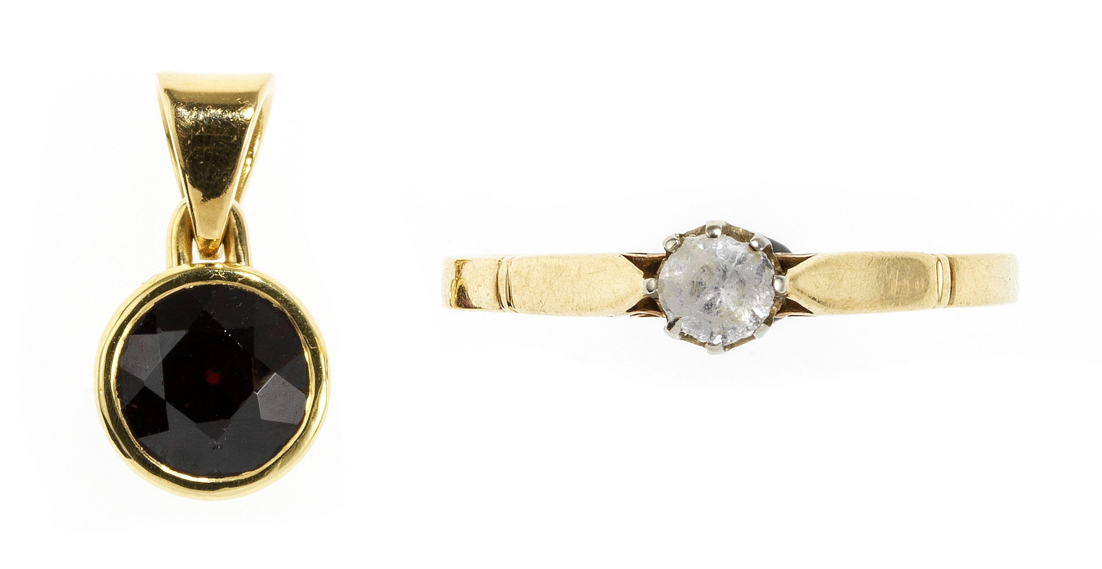 3082. Lot d'une bague sertie d'une pierre d'imitation pour le diamant et d'un pendentif serti d'un grenat taille brillant