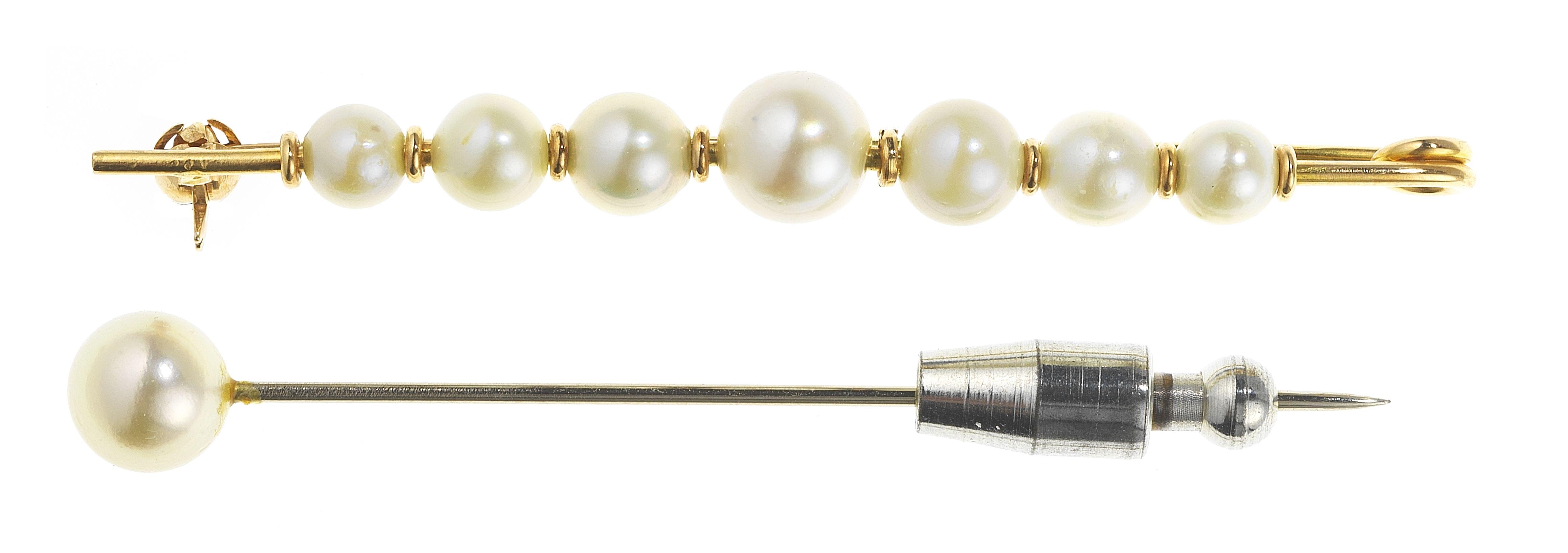 3096. Lot d'une broche-barrette et d'une épingle à cravate serties de perles (D entre 4,5 et 7,5 mm)