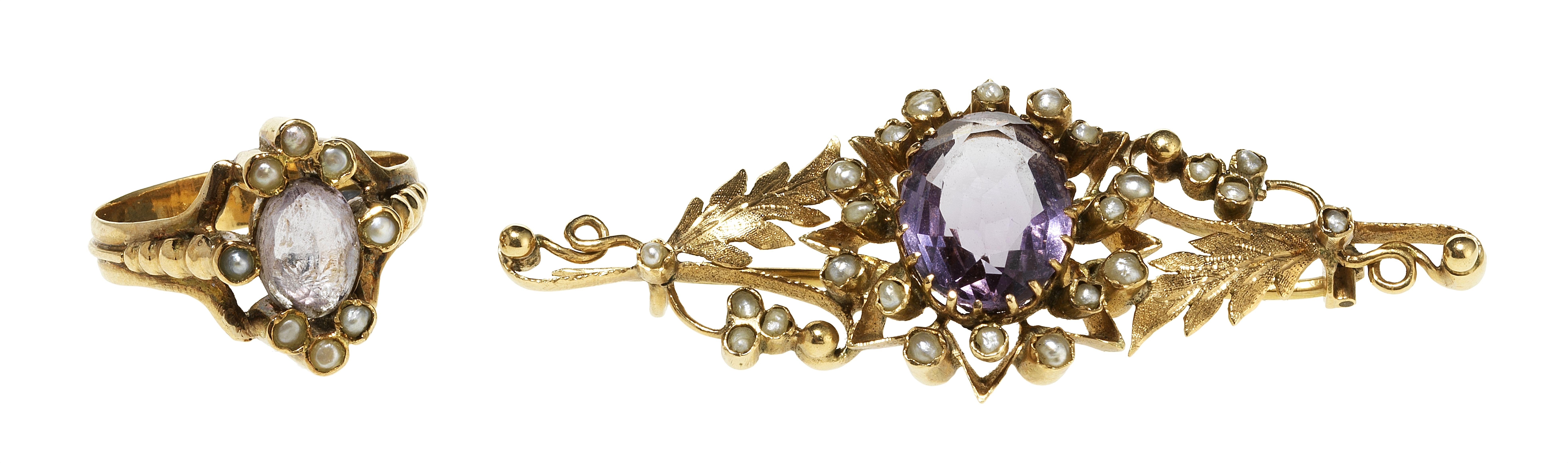 Centrées chacune d'une améthyste ovale entourée de demi-perles, travail XIXe s, or 750, doigt 52-12, poids brut 10 g