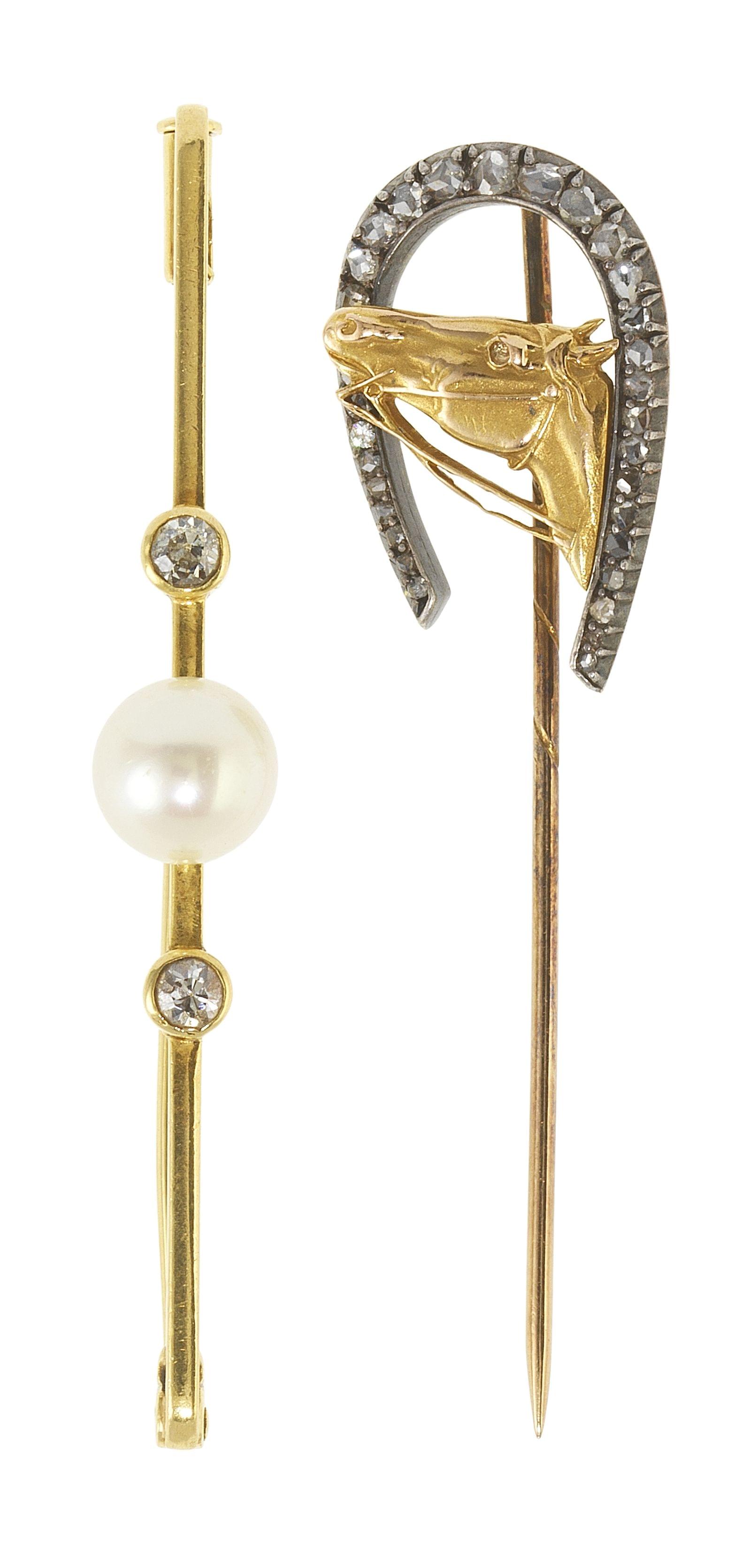 La première à motif de fer à cheval serti de roses de diamant et la seconde sertie d'une perle (D env. 7 mm) épaulée de deux diamants, or 750, 585 et argent, L 5 cm, 7 g