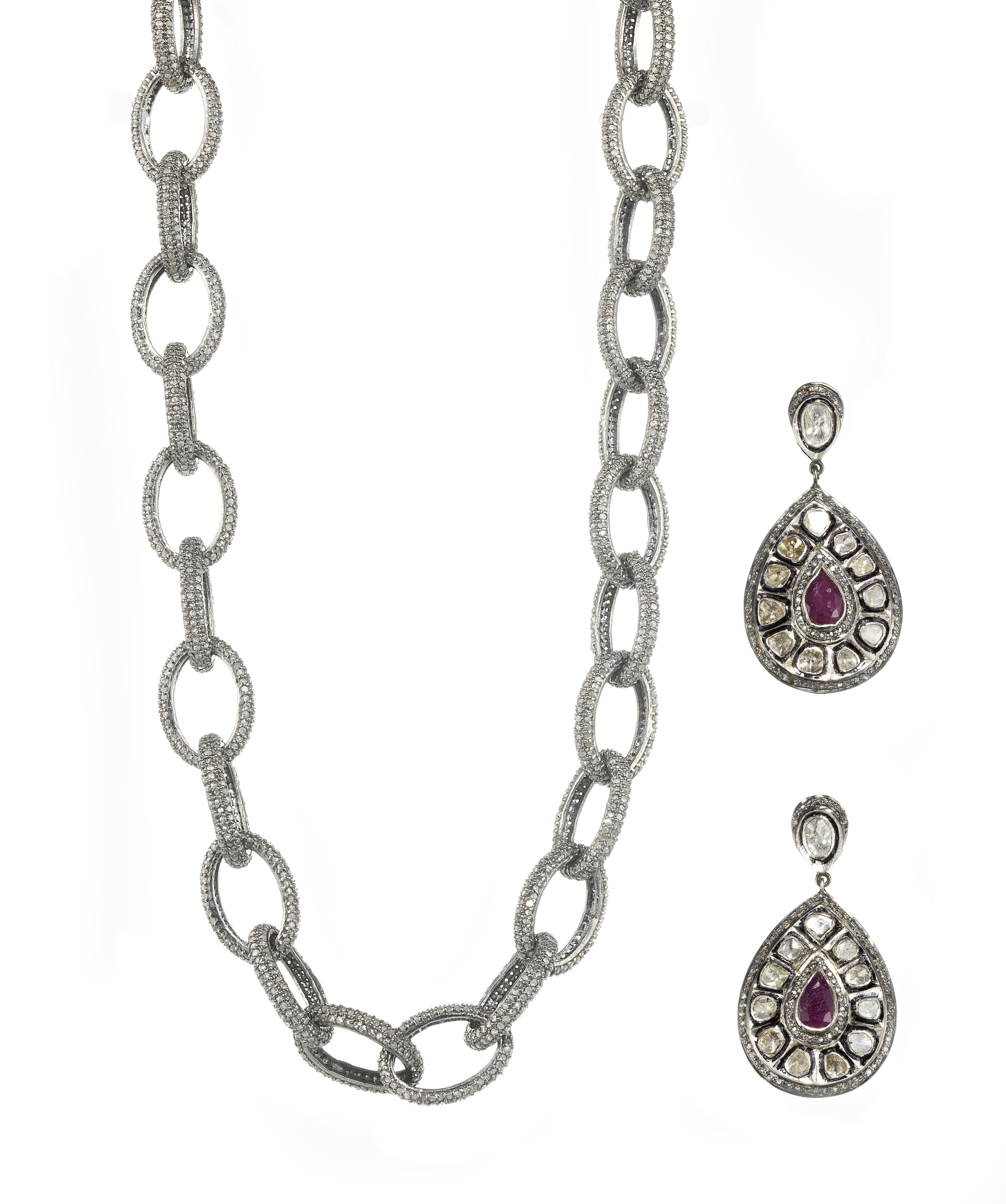 Les premières centrées chacune d'un rubis taille poire entouré de diamants en table, le second à maille ovale entièrement serti de roses de diamant, argent noirci 925, H 5,5 cm, L 44 cm. Pour les lots précédés d'un *, la TVA de 7,7% est due sur l'entier du prix d'adjudication.