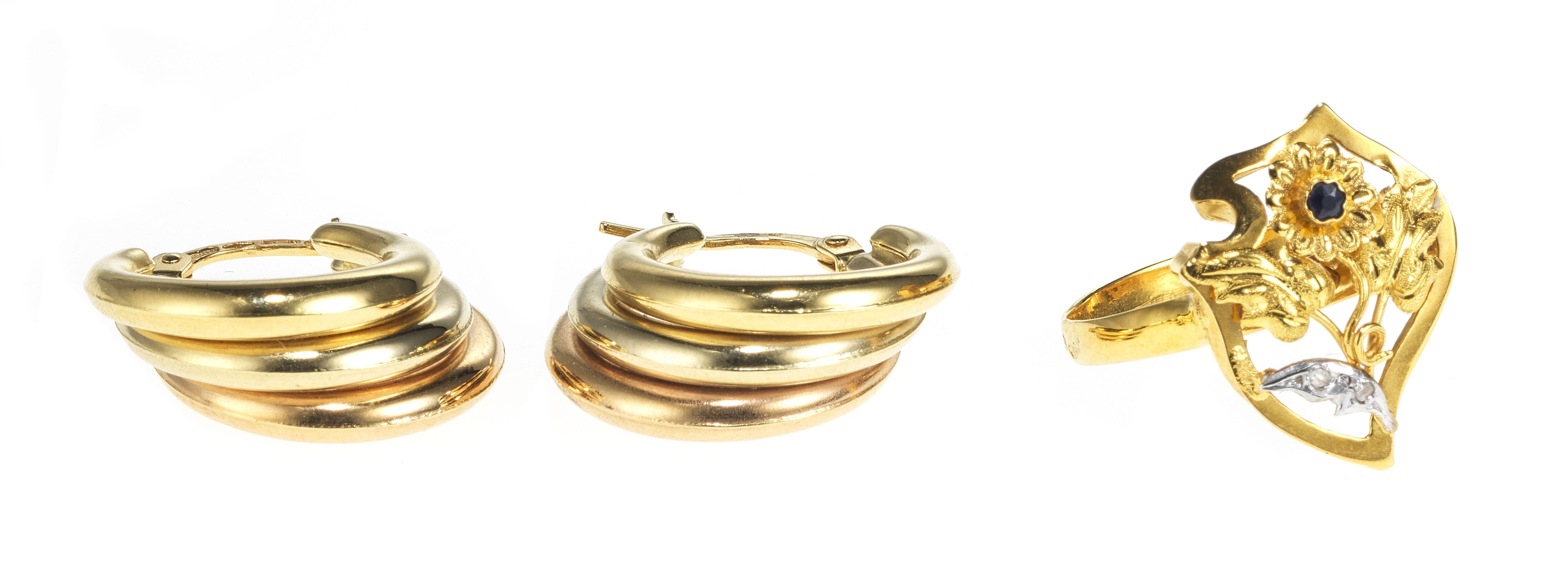 3245. *Lot d'une paire de créoles trois ors et d'une bague de style Art nouveau figurant une fleur sertie d'un petit saphir