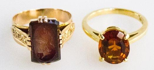 3055. Lot de 2 bagues, 1 sertie d'une citrine et l'autre d'un camé